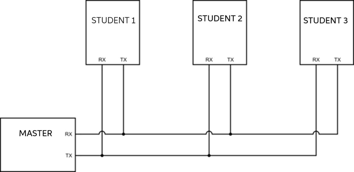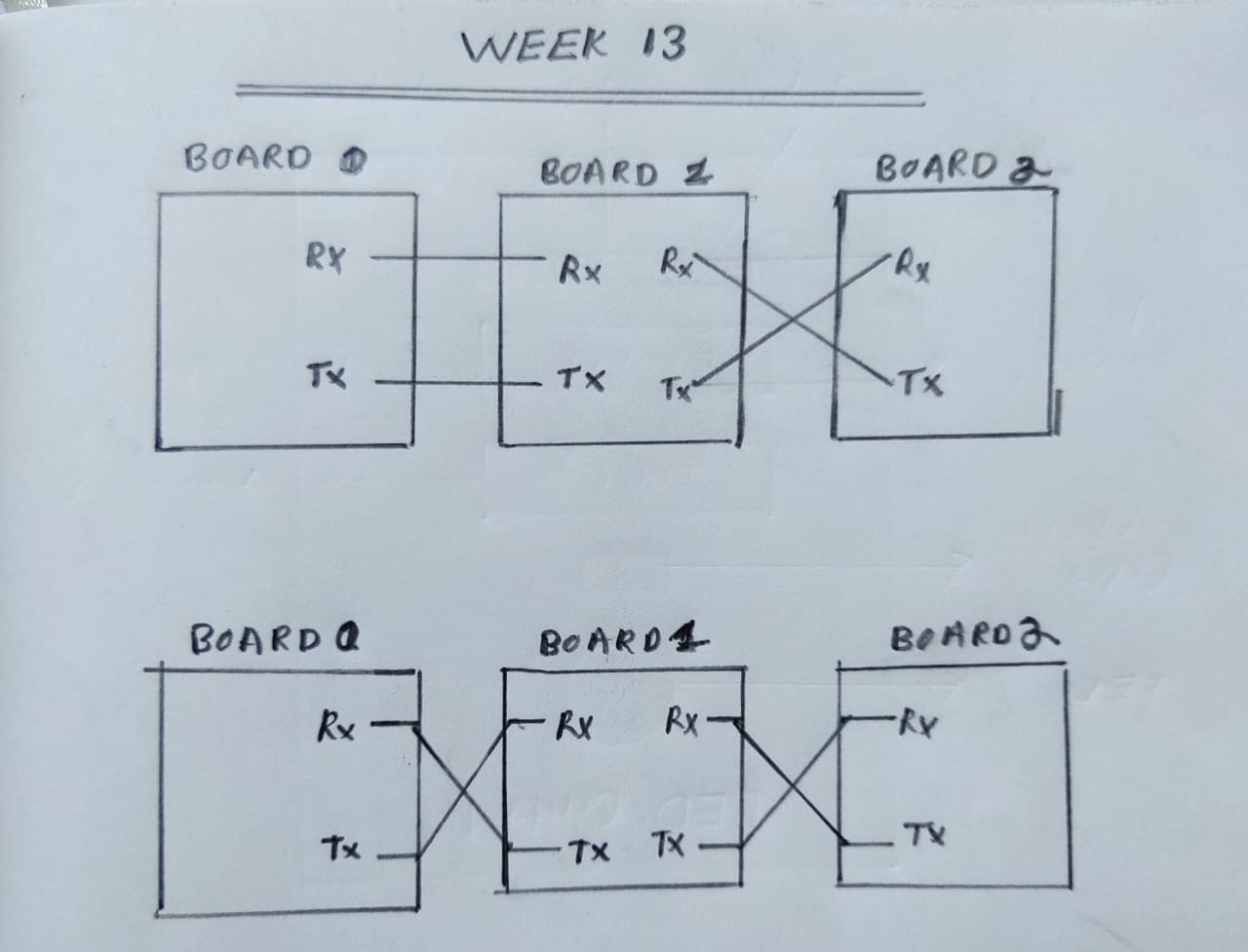 The idea for this is to create a short project. The project involves three boards that communicate with each other. Each board will have an RGB LED and a push button, which will be connected to each other using UART. Each push button will receive a specific color value, and upon pressing the button on the first board, all the LEDs on the board will illuminate with the assigned color. Similarly, other buttons will cause the LEDs on the other board to glow in accordance with the pressed button's assigned color.