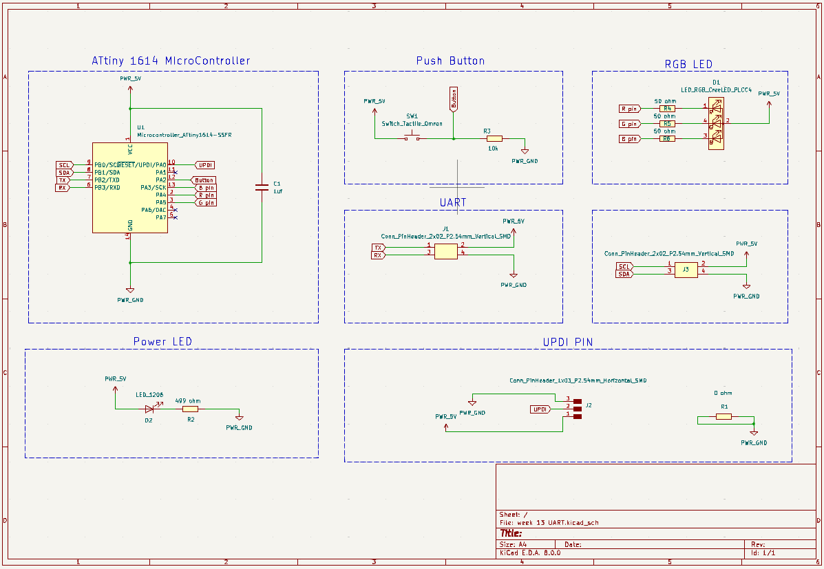 This week, I chose the ATtiny1614 as my microcontroller. To choose the microcontroller, I checked the number of pins that I needed to complete my desired task. I found that I need around 7 pins. So ATtiny412 would not be sufficient for my project, and I decided to choose ATtiny1614.