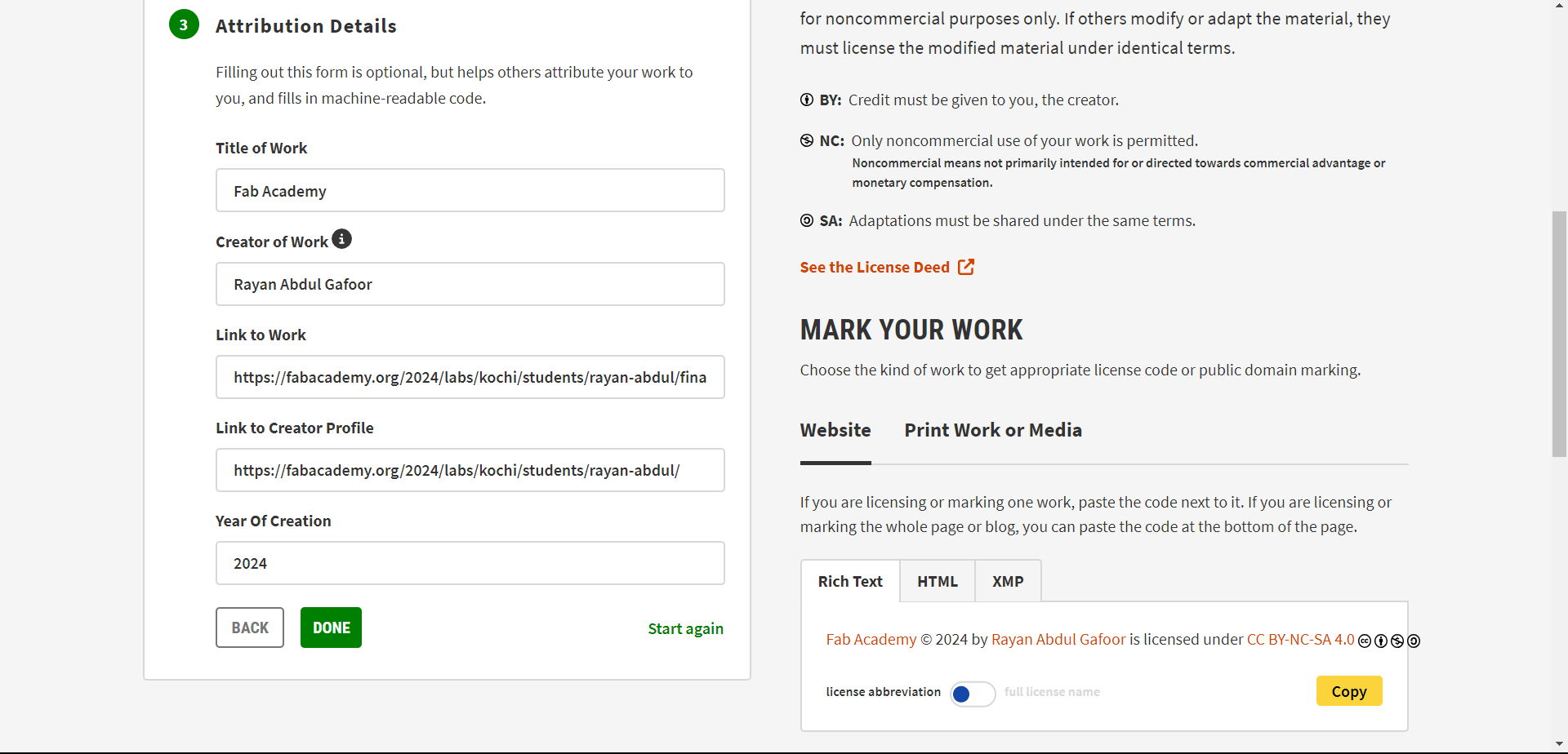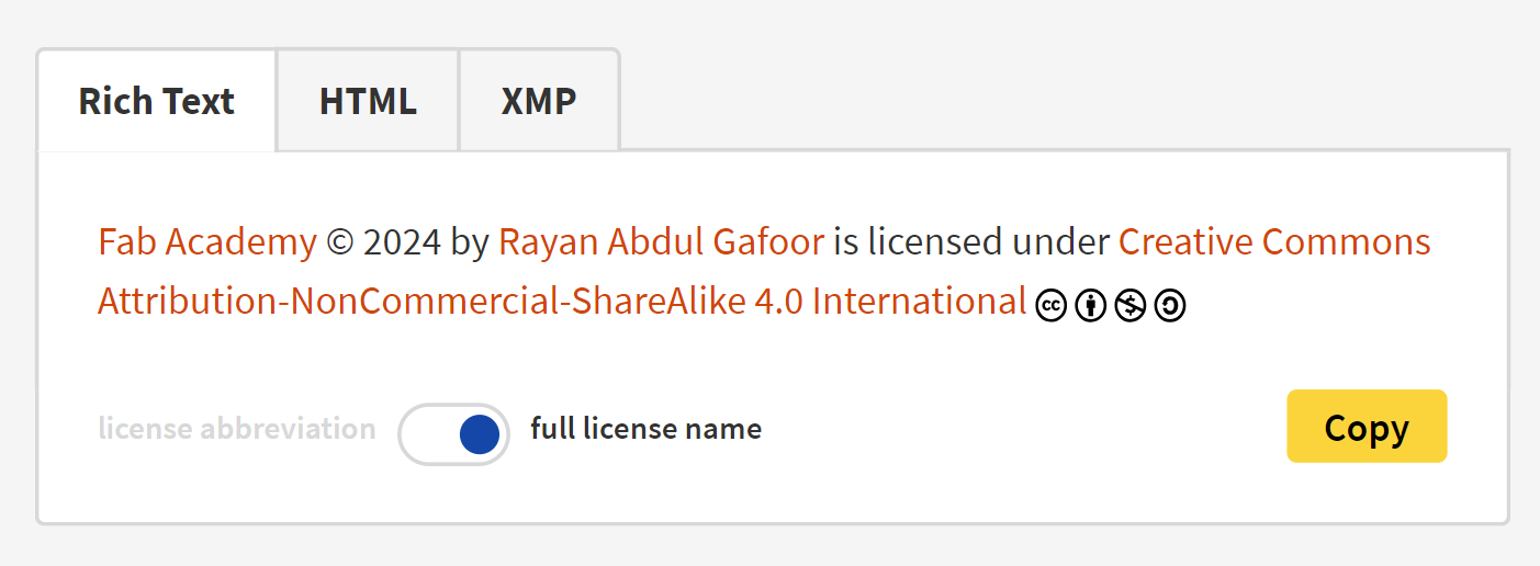 Before selecting a license, it's crucial to understand the intended use of your project, code, design, etc. Since my project is inspired by and widely used in the fab community, I decided to go with a Creative Commons license. I expect others to use the information and the project file for educational purposes and not for commercialising.