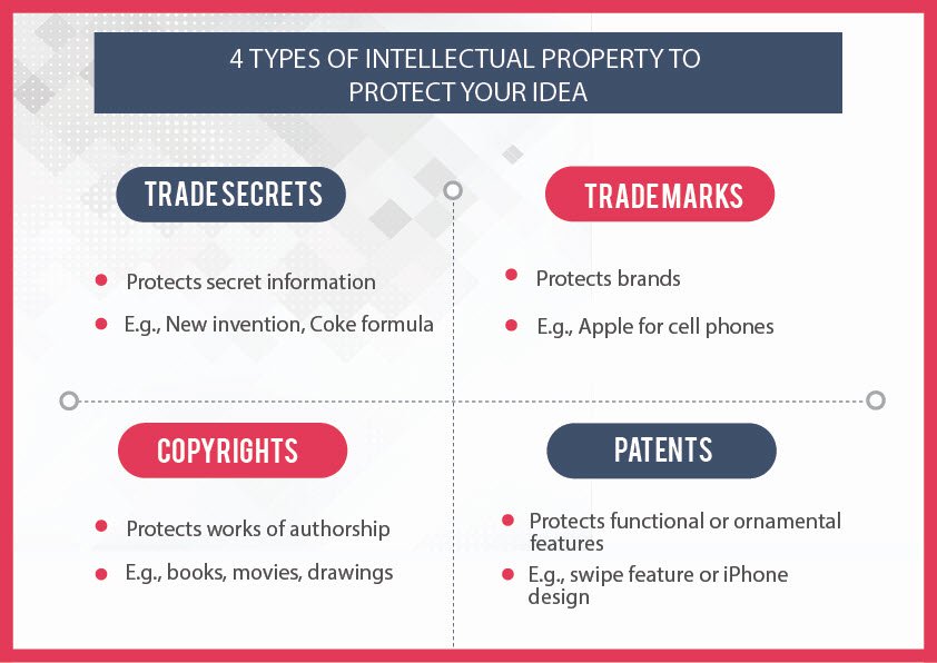 Intellectual property rights fall into four categories: patents, trademarks, copyrights, and trade secrets.