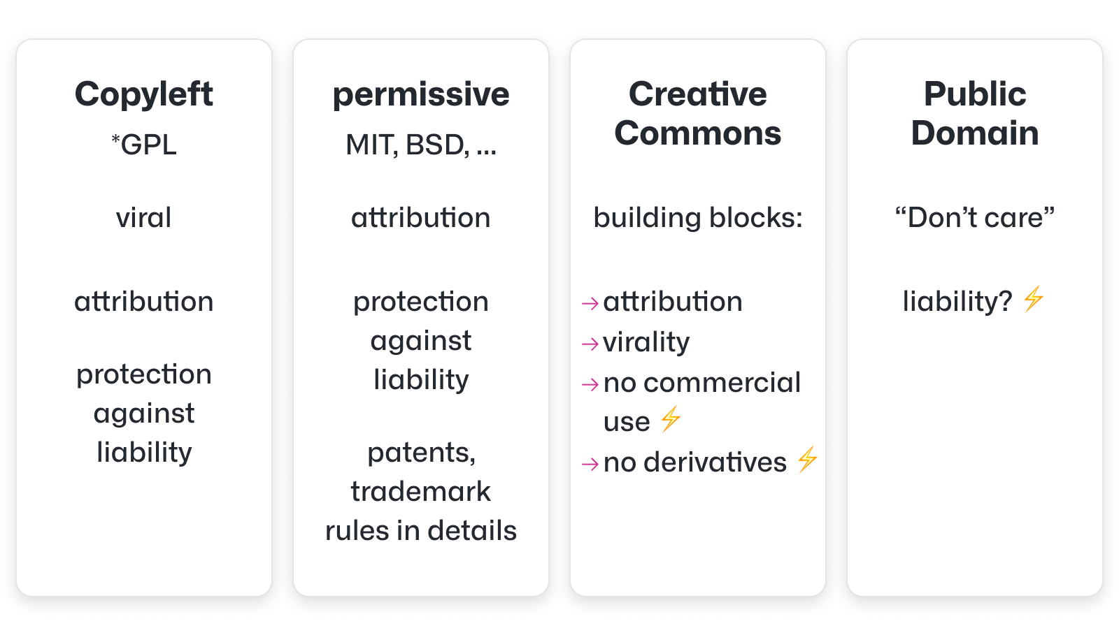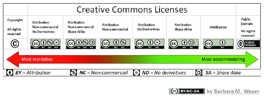 Creative Commons (CC) offers free licenses for usage by creators when making their work accessible to the general public. While not specifically designed for software, CC licenses are used to grant permissions for creative works such as artwork, music, and documentation. These licenses offer a range of permissions, from allowing unrestricted use and modification to specifying certain conditions for reuse, attribution, or non-commercial use.