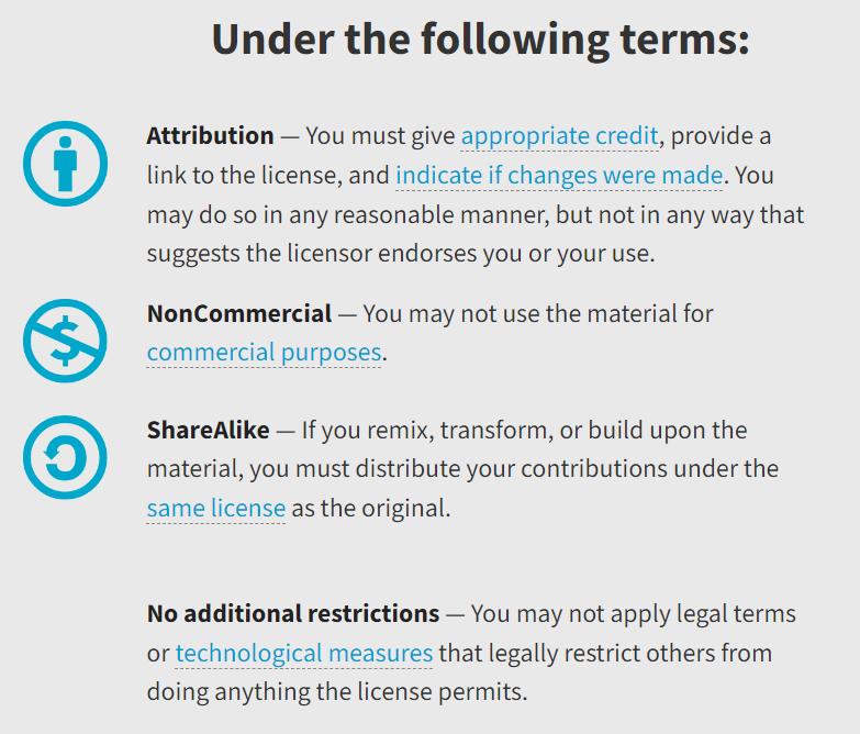 NC: Only noncommercial use of your work is permitted. Noncommercial means not primarily intended for or directed towards commercial advantage or monetary compensation.
