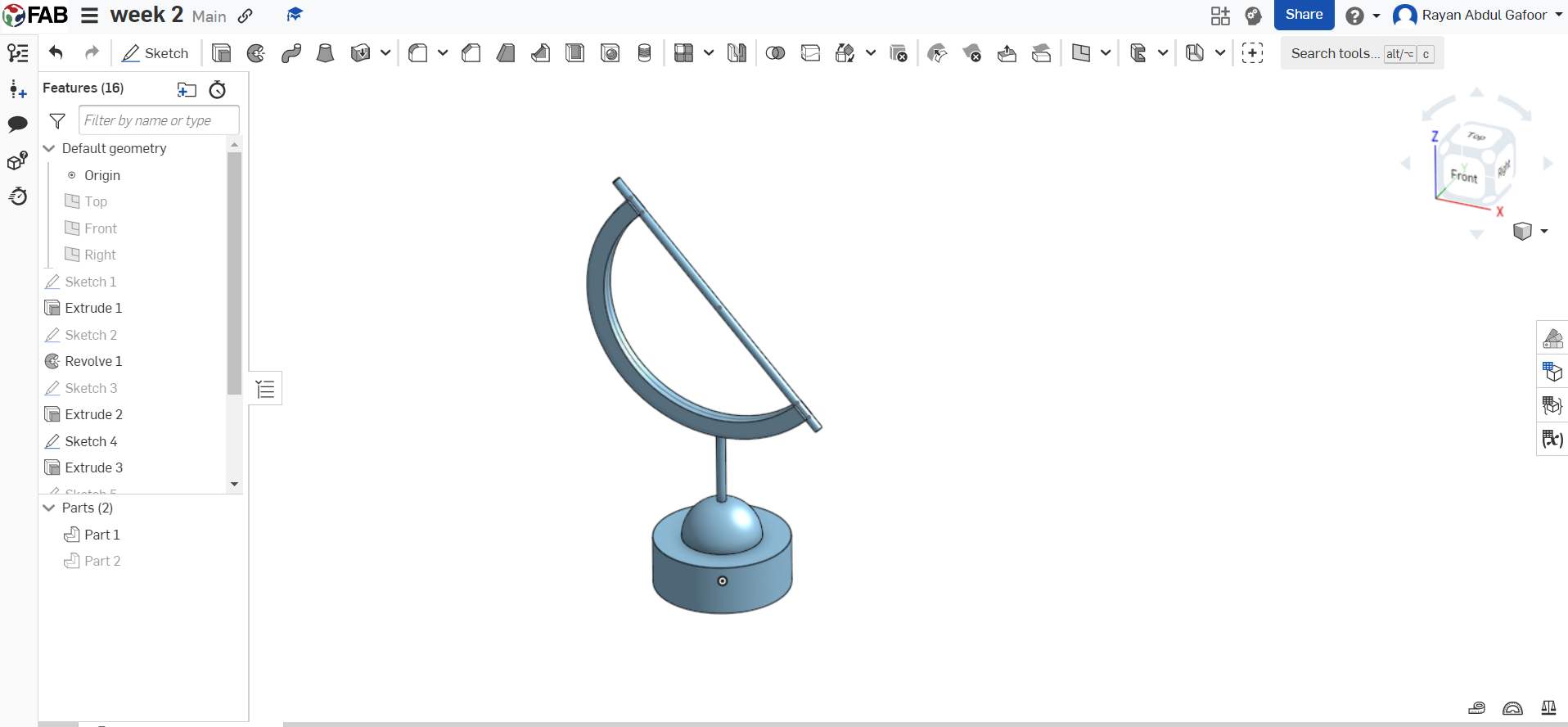 - Use the circle tool and trim tool to draw a semi-circle and extrude it.