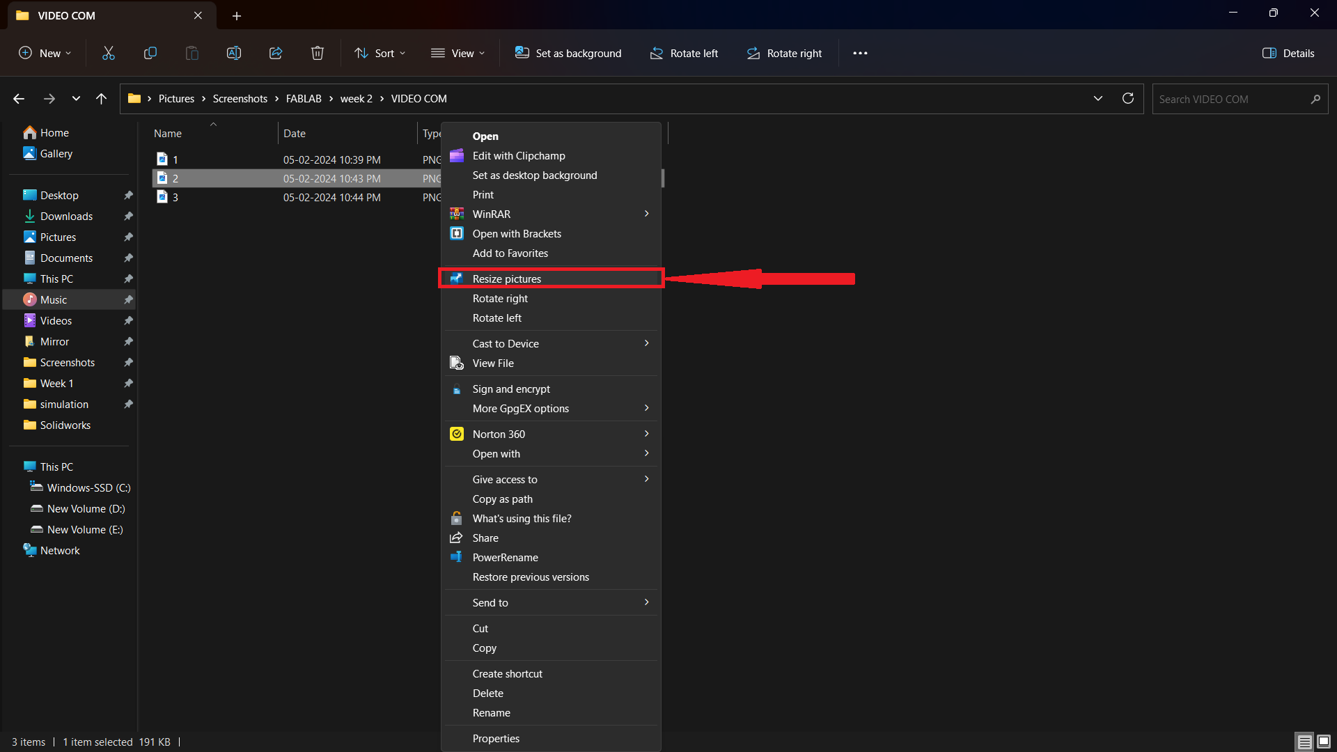 👉 First, right-click on the pictures you want to shrink and choose "resize picture".