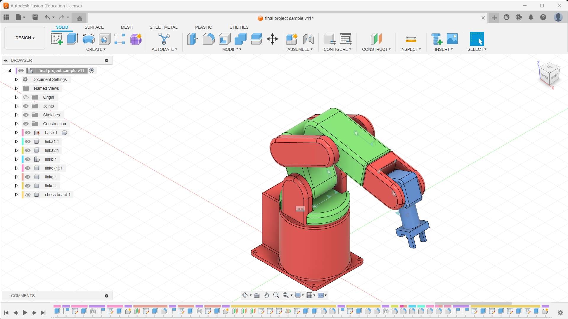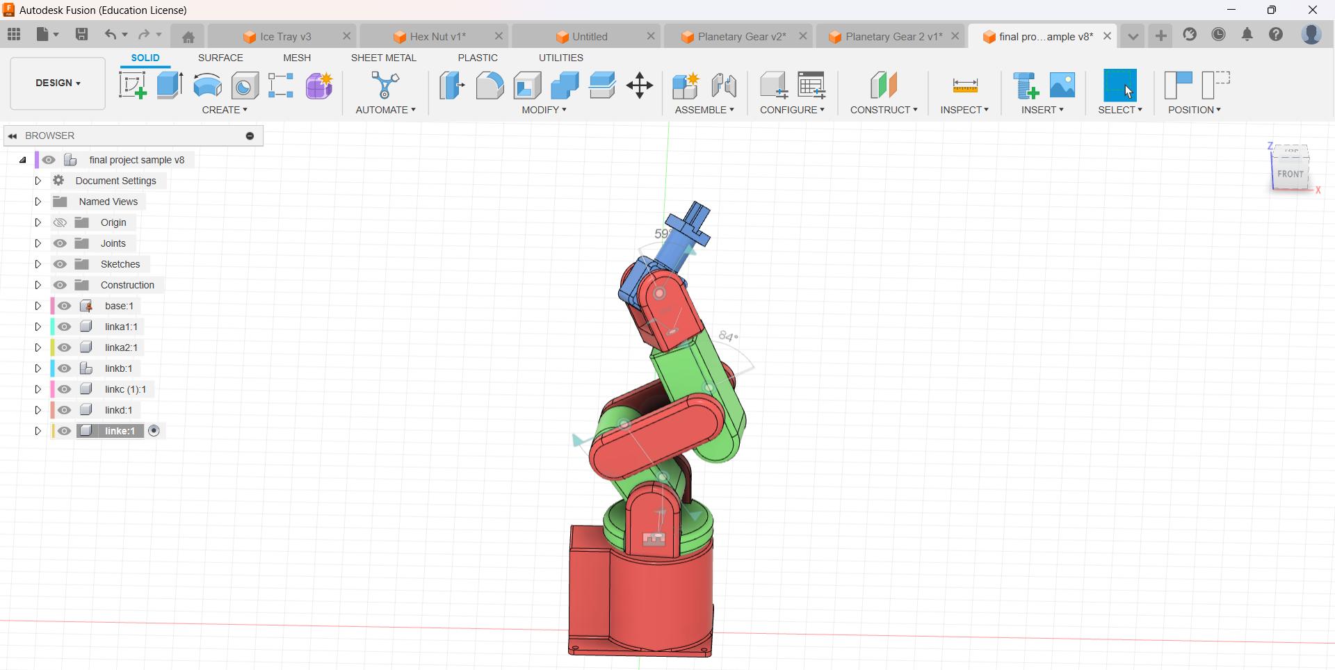 - Model each joint and link of the manipulator based on the defined specifications. Use sketches, extrusions, and rotations to form the basic structure.