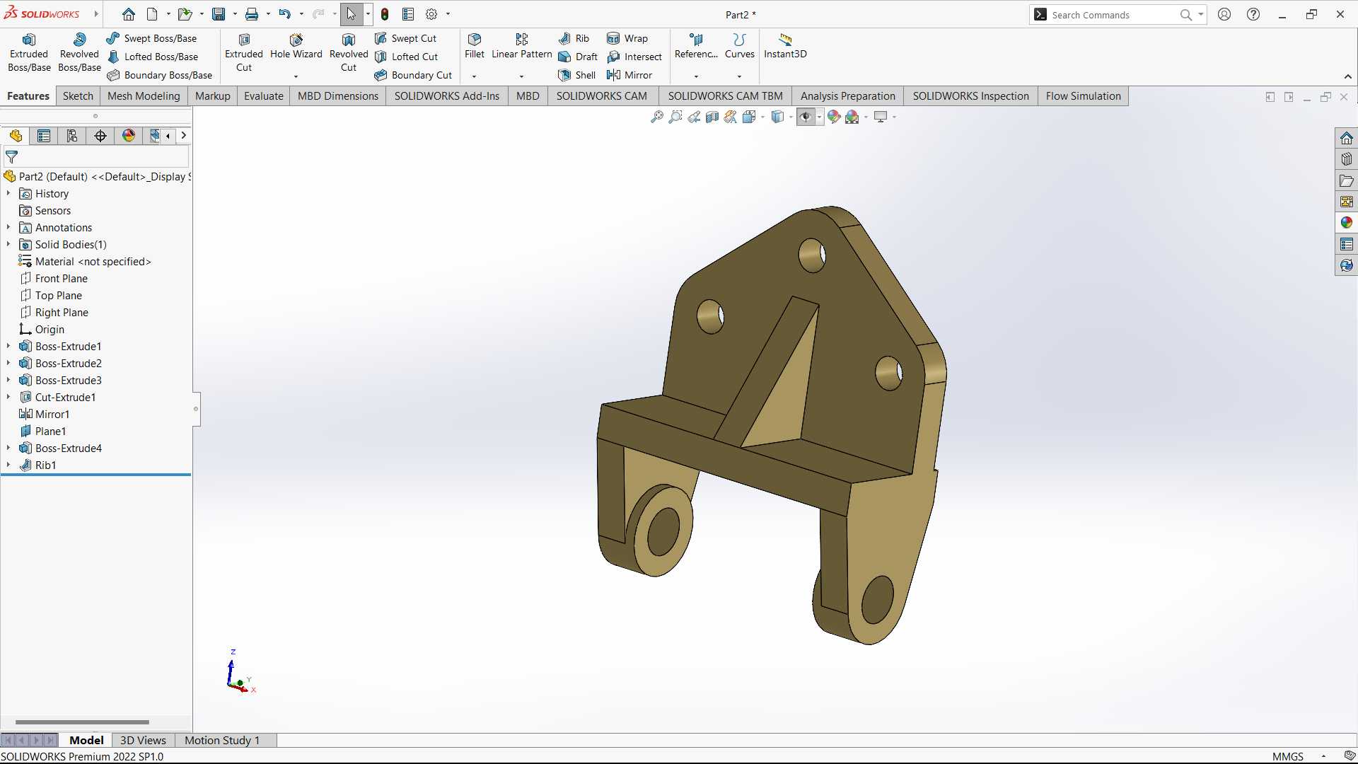 - Depending on design requirements, add more features such as holes, fillets, chamfers, or cuts. Use features like Extrude Cut, Fillet, and Chamfer to modify the bracket as needed.