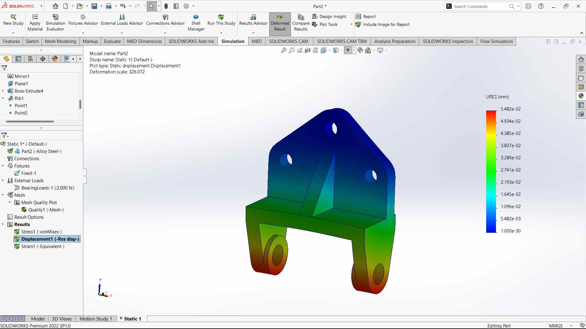 - Here is the result of the displacement of the bracket when the static load is applied.