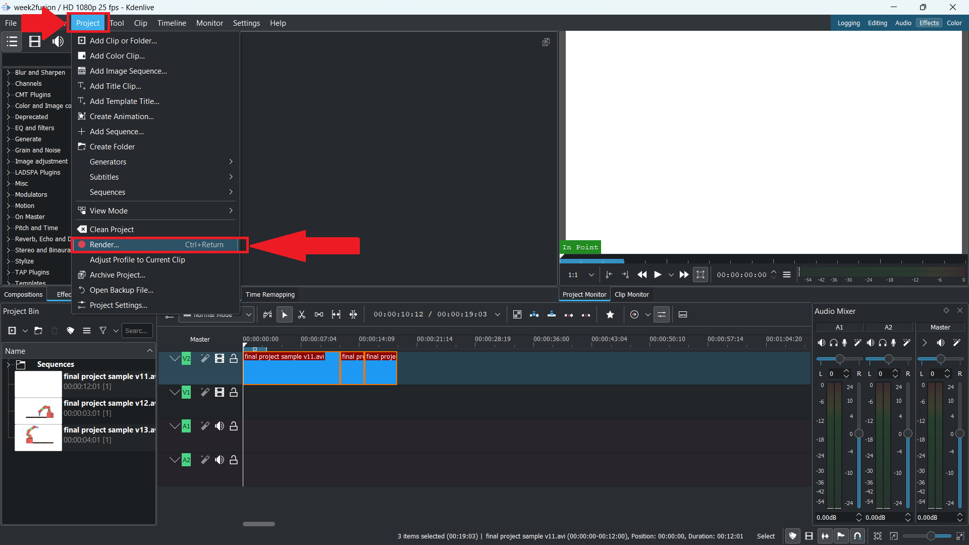 - Once done with editing the video, select the “render” option from the “project” tab or press “ctrl + return” from the keyboard.