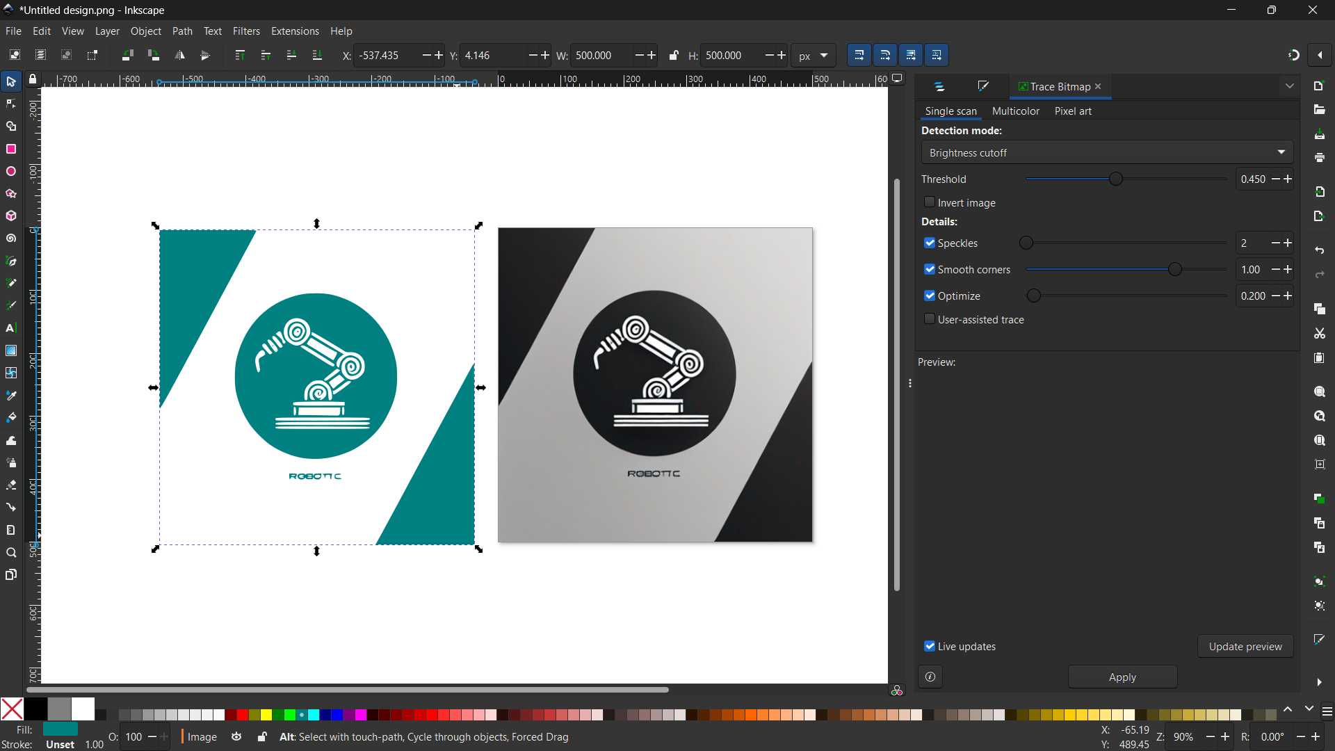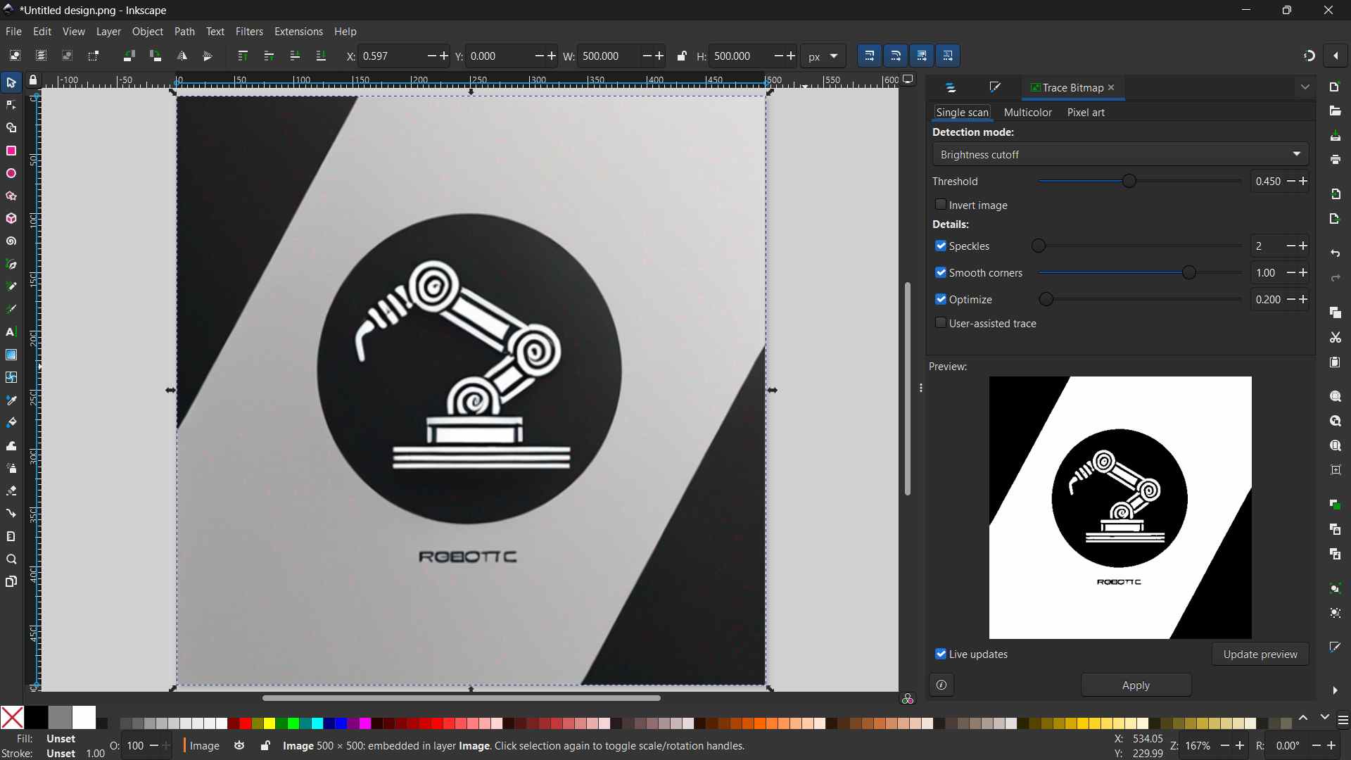 🟩 From the top menu bar select 👉 “Path” 👉 “Trace bitmap” 👉 “Apply”