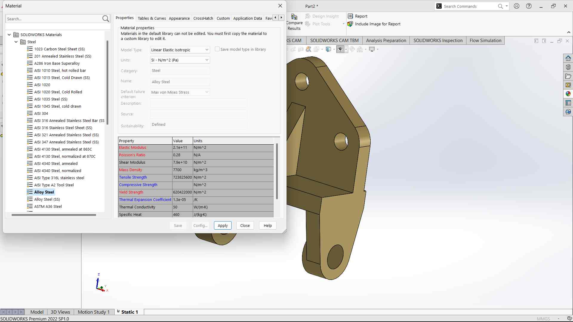 - Define the material properties of the bracket. Right-click on the "Materials" folder in the Simulation tree and assign the appropriate material to the bracket.