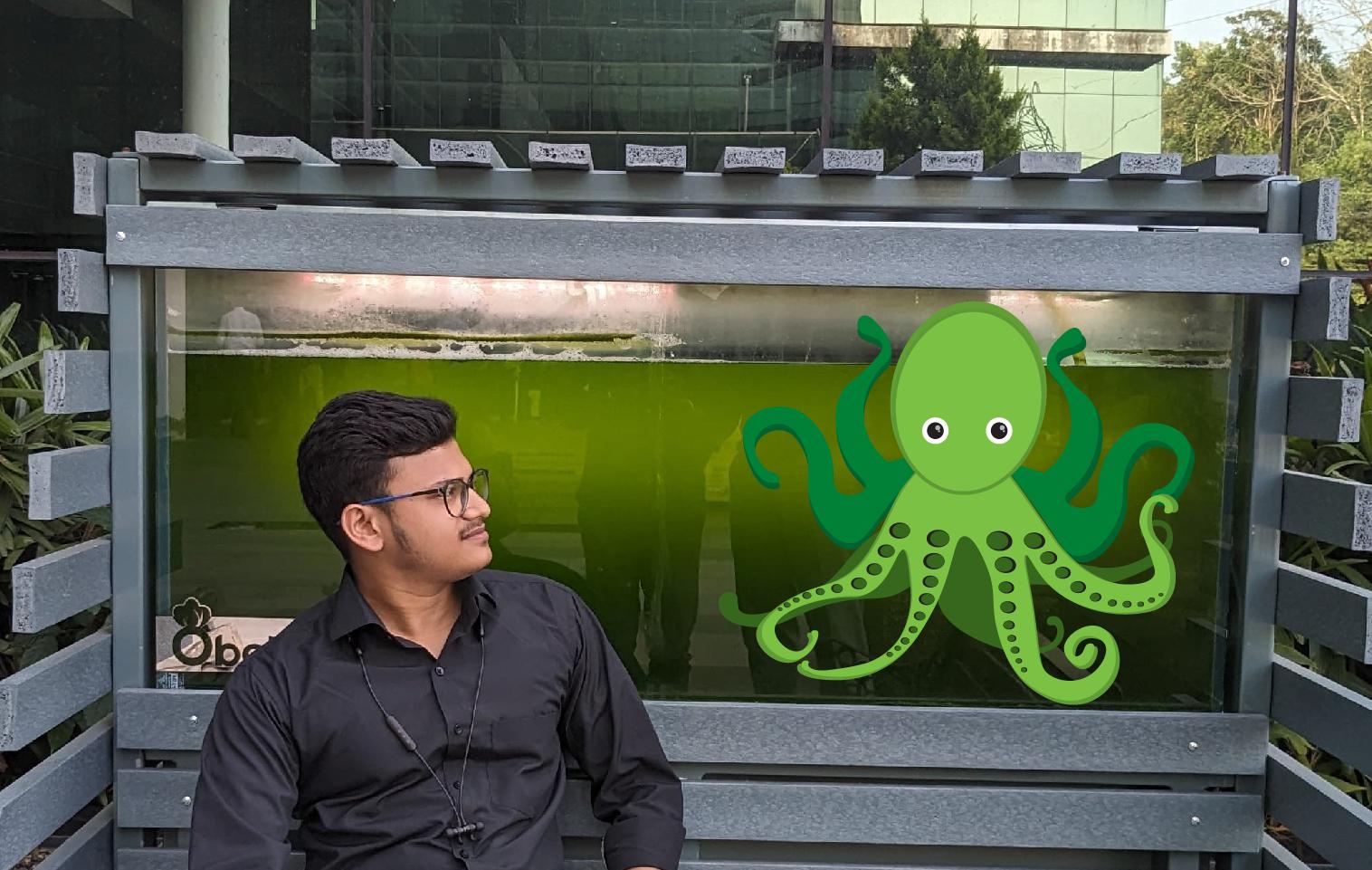 🟩While looking for a design to create in Adobe Illustrator, I discovered a place near to fab lab and imagined a green octopus emerging from it. I decided to take a picture.