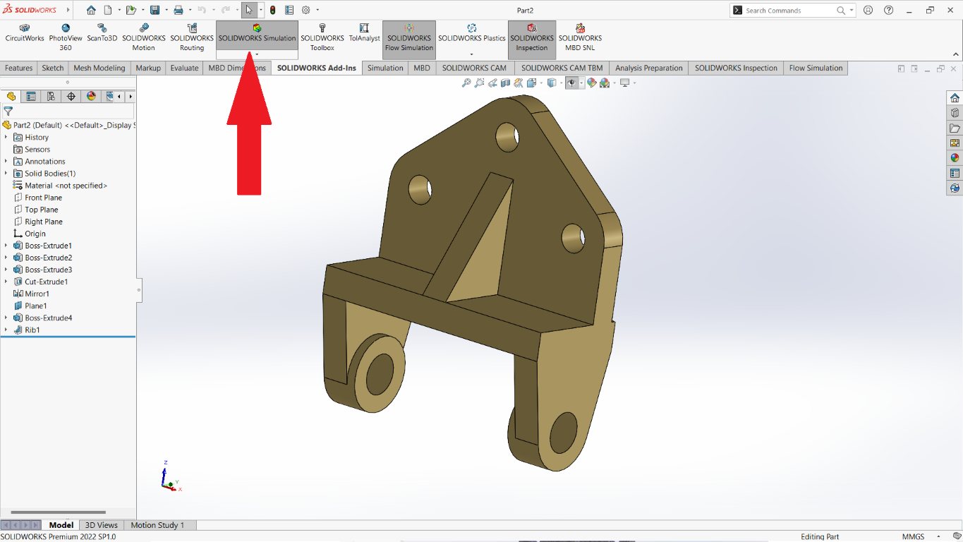 - Once the 3D model is complete, switch to the SolidWorks Simulation environment by selecting the "Simulation" tab from the SolidWorks Add-ins.