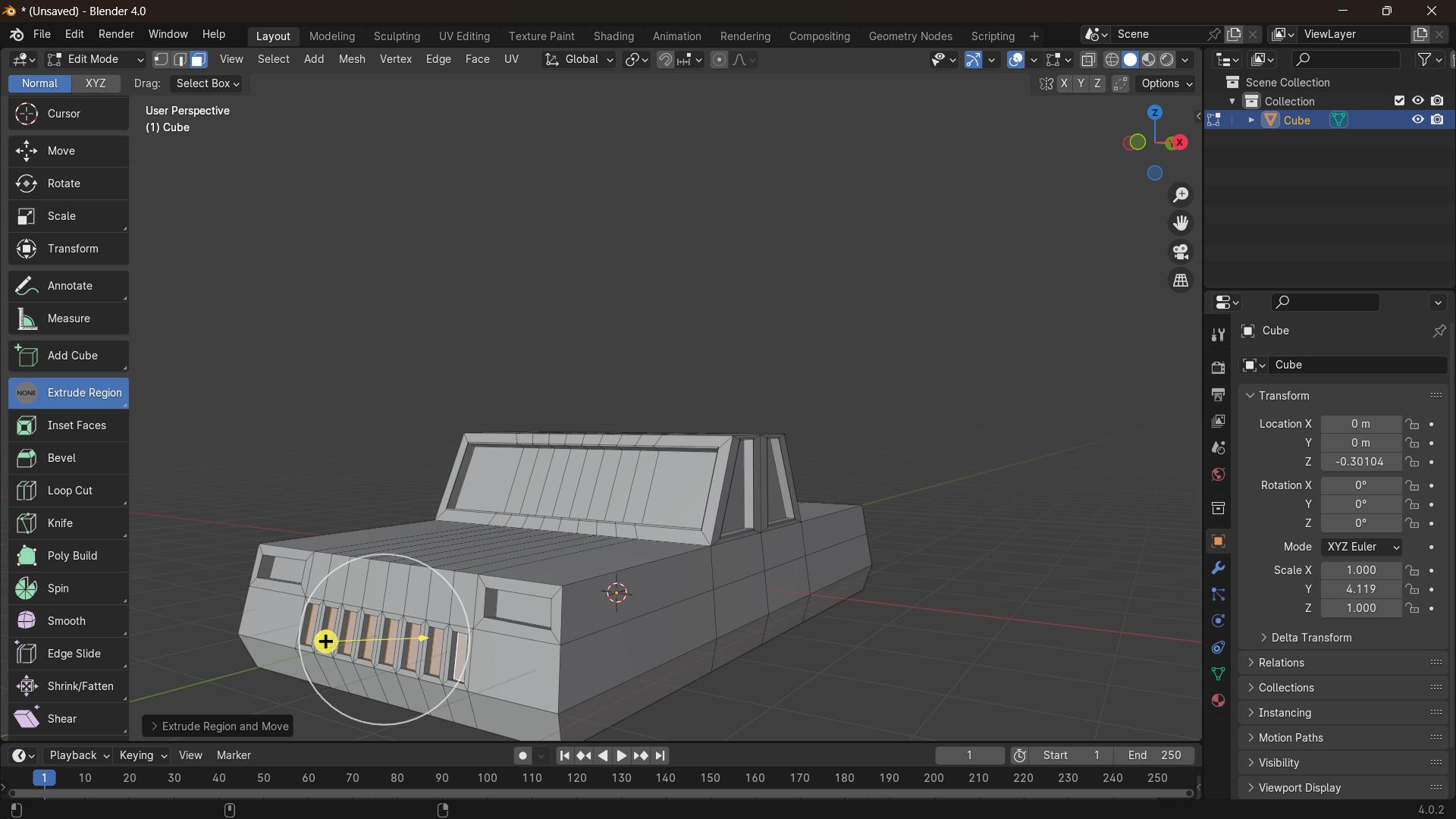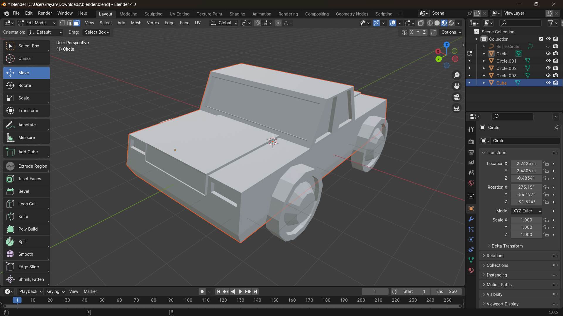 - Finally, from the “object mode", I created the circle for the wheels and moved to the “edit mode” to extrude, scale, and inset the faces of the wheels.