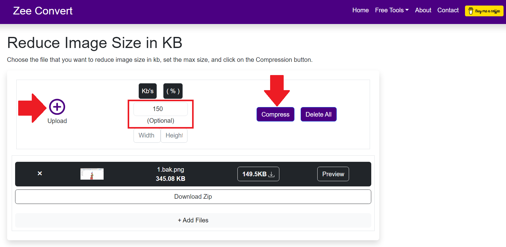 - Click on the compress button to start reducing the image size in kb.
