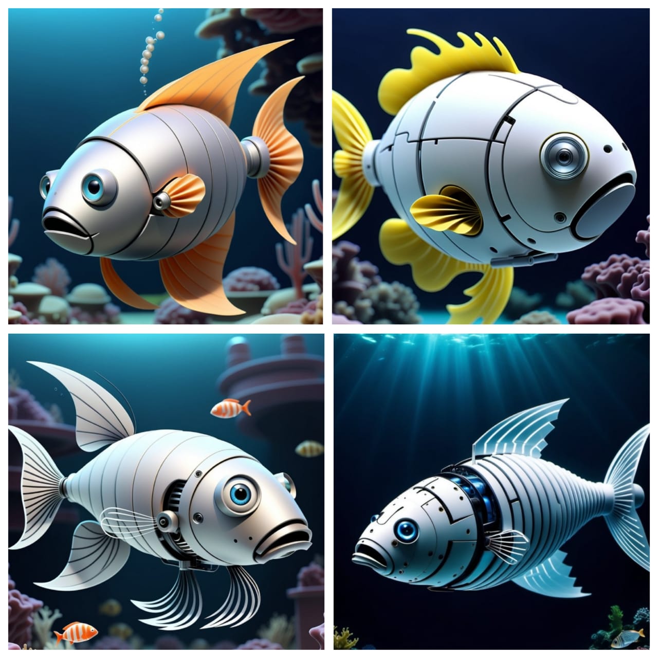 - I have used the prompt: Could you please keep in mind the following phrase: "An illustration of a futuristic, soft, robotic fish for underwater exploration alongside real fish”.