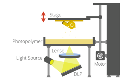 Similar to SLA, DLP also uses a liquid resin cured by light to create objects. However, instead of using a laser to cure the resin layer by layer, DLP printers use a digital light projector to project an entire layer of the object at once, speeding up the printing process.