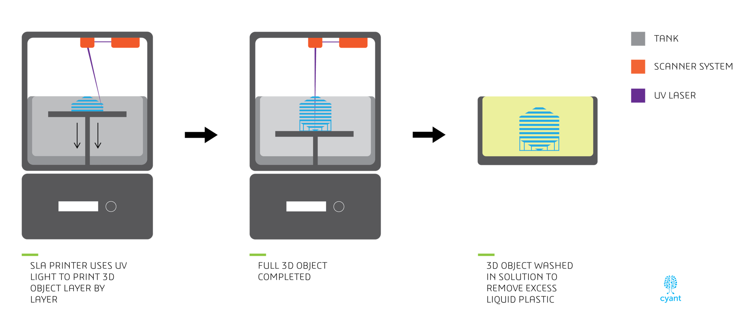 SLA uses a liquid resin cured by ultraviolet (UV) light to create objects. A build platform is submerged in a tank of liquid resin, and a UV laser selectively cures the resin layer by layer, solidifying it to form the desired shape.