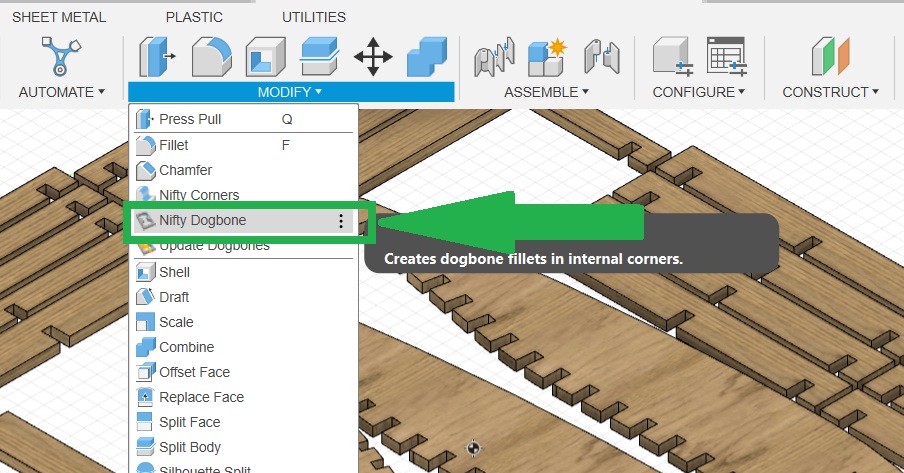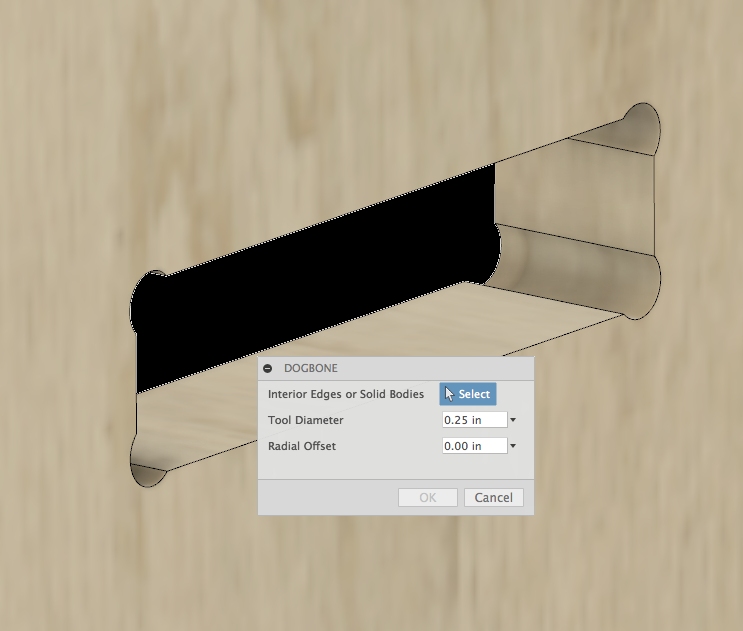 After successfully installing the plug-in, select "Nifty DogBone" from the modify tab. Select all the required parts and provide the tool diameter and radial offset values.