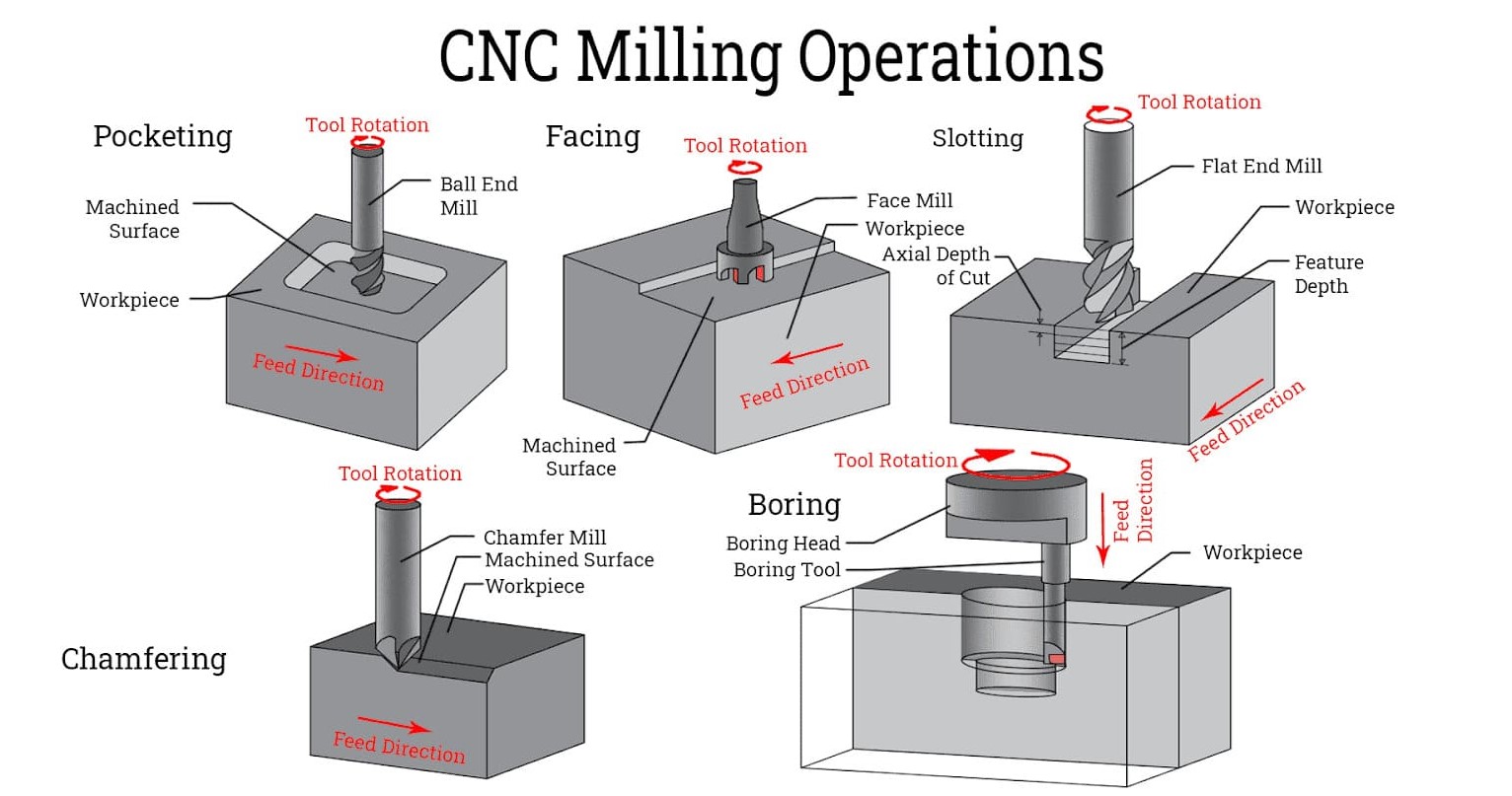 Mills use rotating cutting edges to remove material from the workpiece. The cutting action may be in the axial, radial, or both directions, depending on the type of mill and the operation.