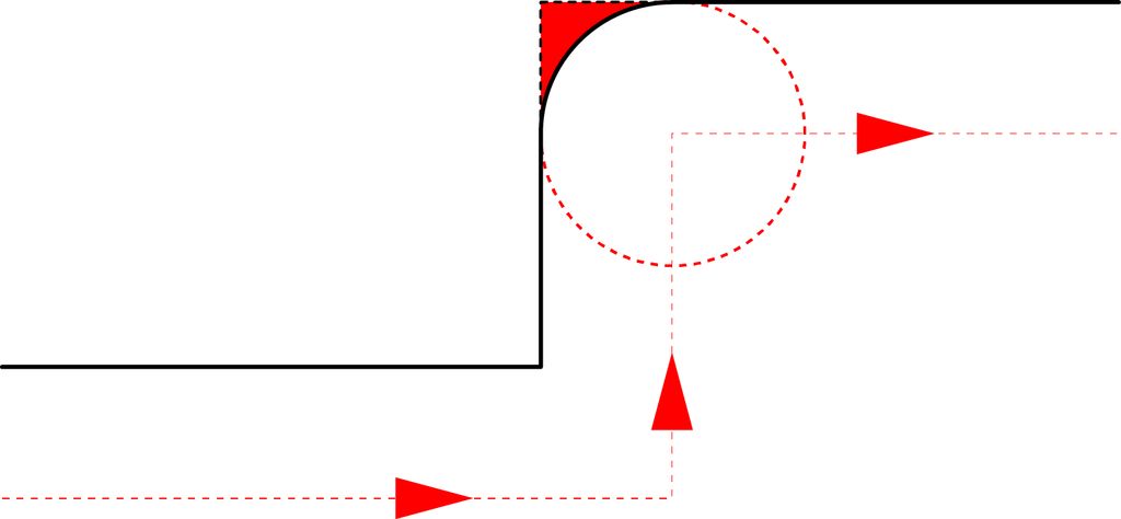 The image below illustrates the tool and its path. Basically, the tool will mill the sharp corners marked as red areas in the figure below. So the parts won’t fit together. We use a dog bone fillet to solve this problem.