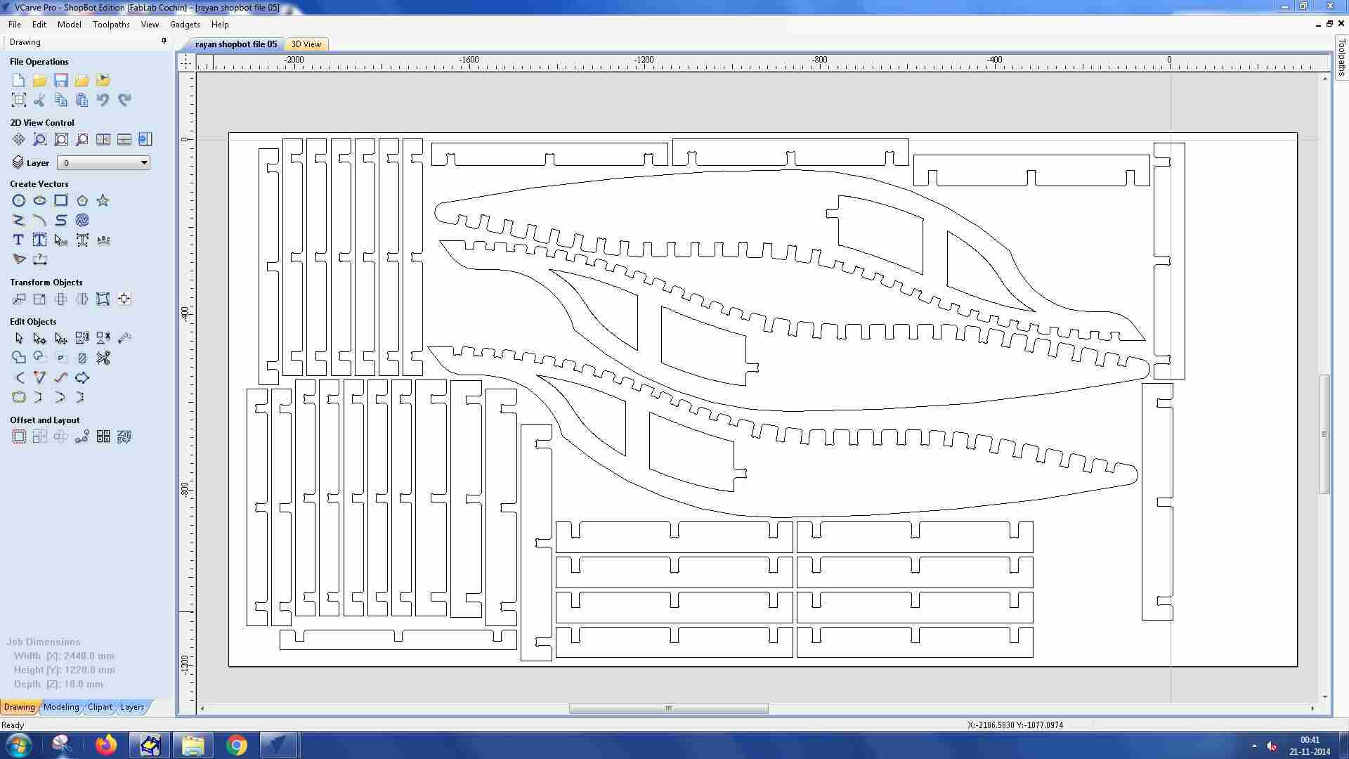 I opened the V-Carve Pro software and imported the DXF file by selecting the import vectors option within the File menu. The plywood measures 2440 x 1220 mm and has a thickness of 17.5 mm, despite its advertised 18mm thickness.
