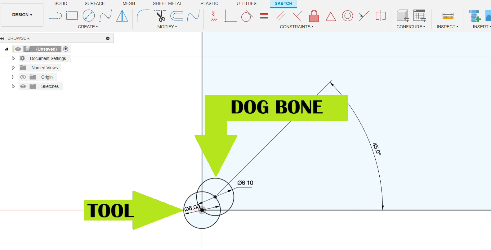 The figure below illustrates the creation and application of the dog bone fillet. If the tool has a diameter of 6 mm, then the dog bone has a diameter of 6.1 mm. The tool will follow the edges, ensuring it remains tangent to them. Applying the dog bone fillet to the sharp corner will make it easier for the machine to form the fillet and continue moving along the edges.