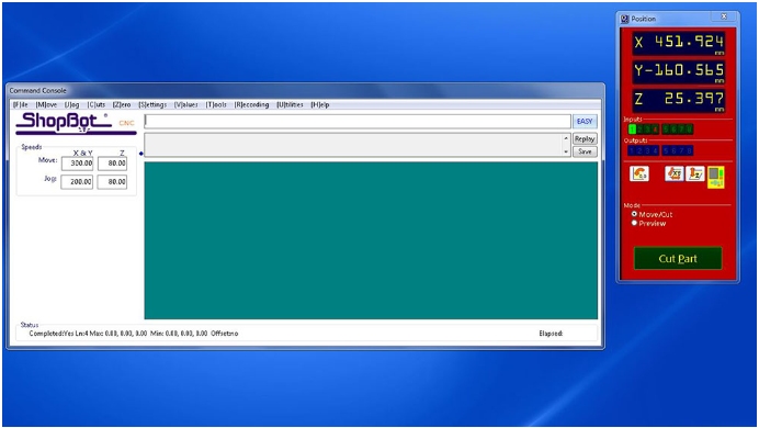 Once the spindle is spinning, we can click "OK," and the Shop Bot will begin running the code line by line. The progress of the code can be viewed on the "Command Console".