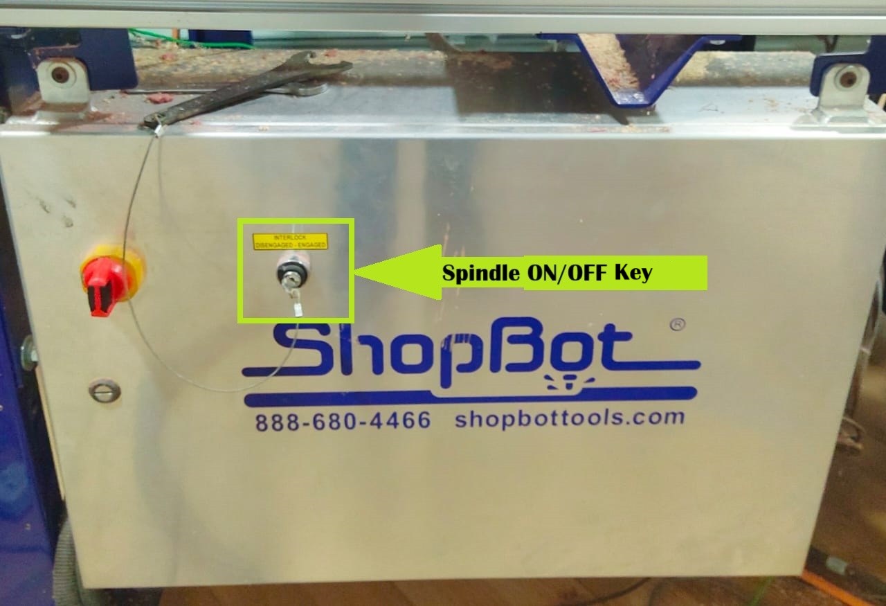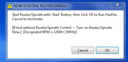 After clicking the "START" button, a window will appear requesting that we switch on the spindle. Use the key on the ShopBot's side panel to turn on the spindle.