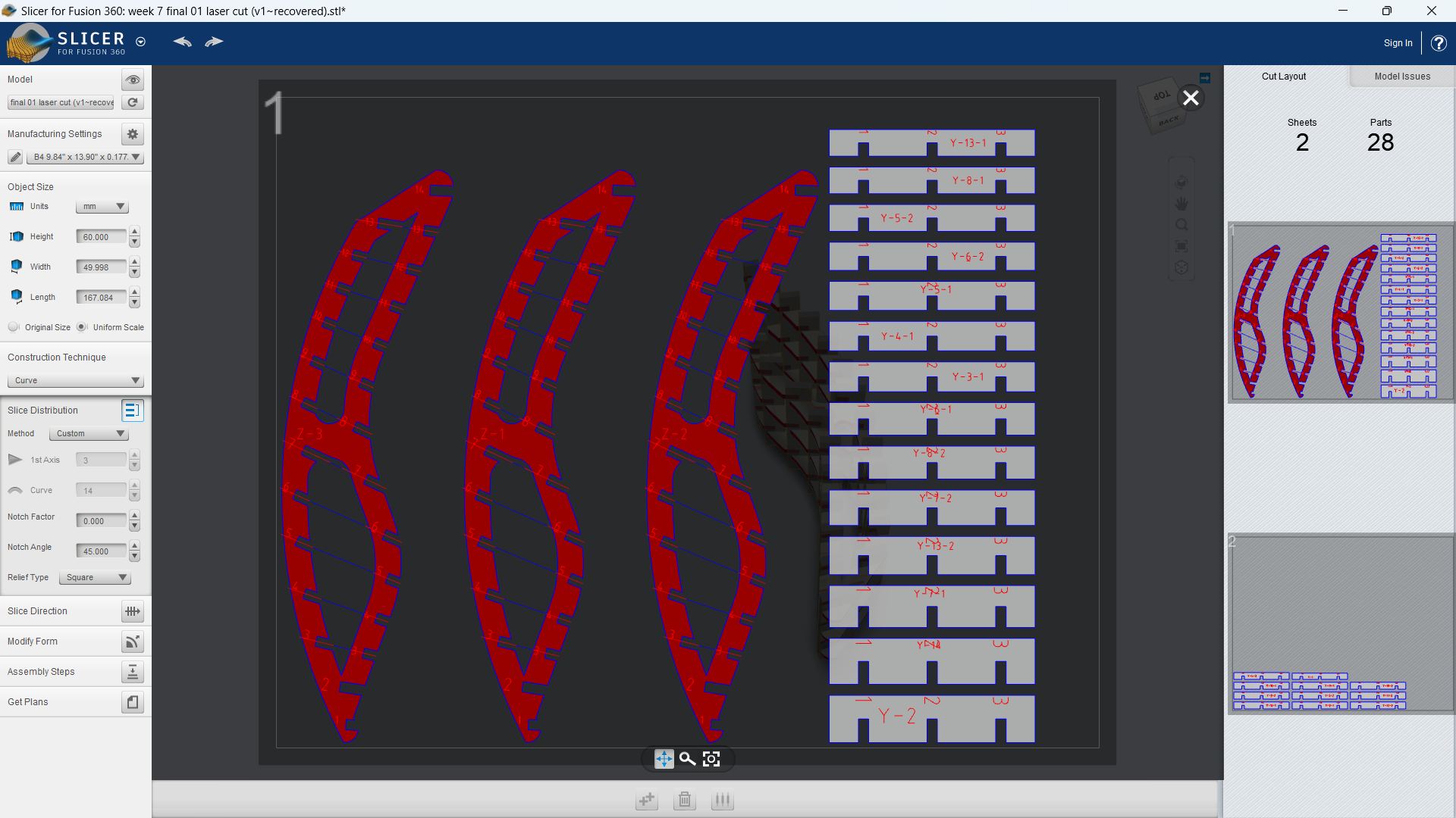 Even though this design was not proper, I decided to use Zund to cut a scaled-down version of it in cardboard. I took advantage of this opportunity to test out the "Silicer for Fusion 360" software. This software is not the proper way to test the scaled-down version of the design. Design 2 outlines the correct method for reducing the size of the design and testing it. However, for this design, I went with the Slicer software because I knew I had to change my design and also explore the software.
