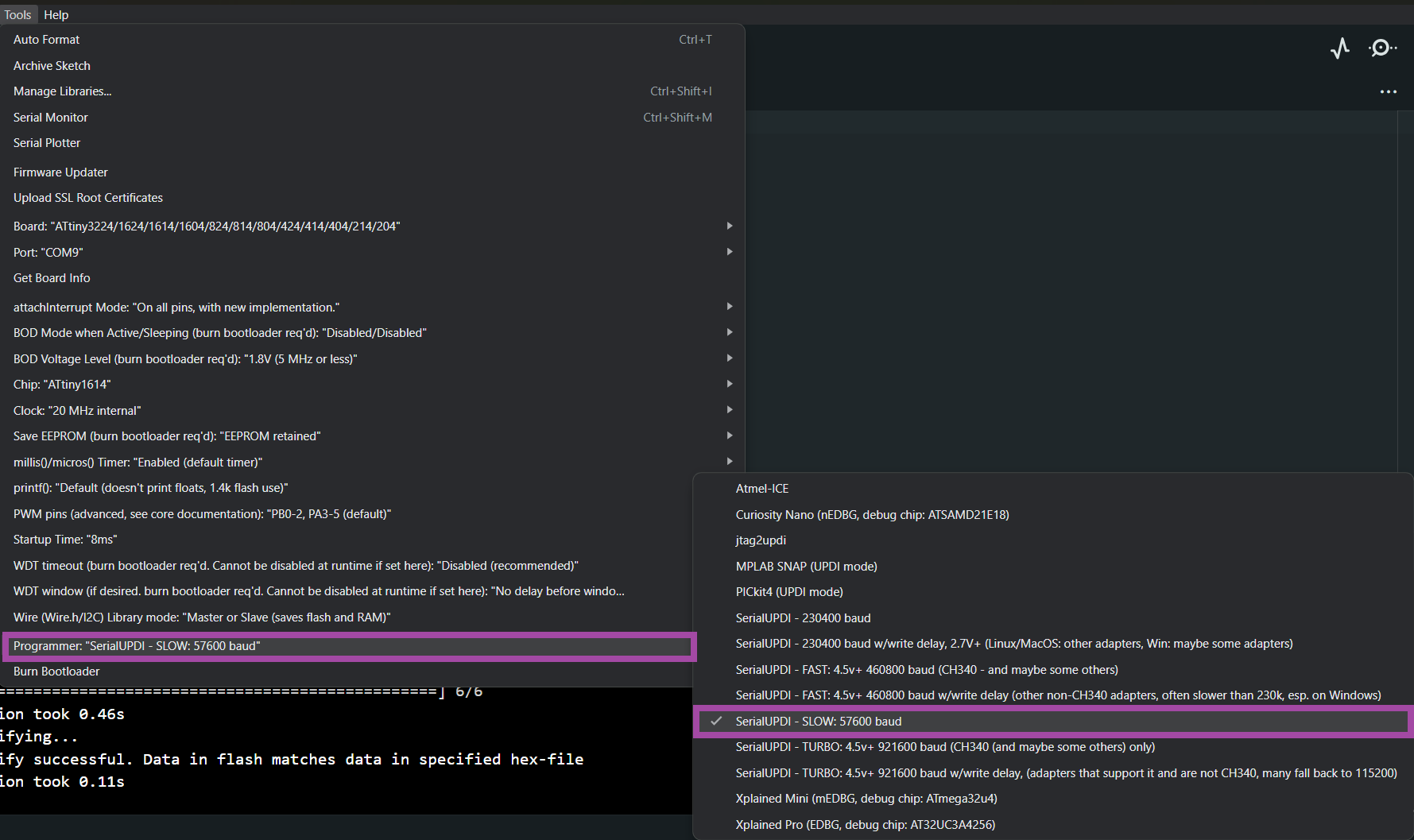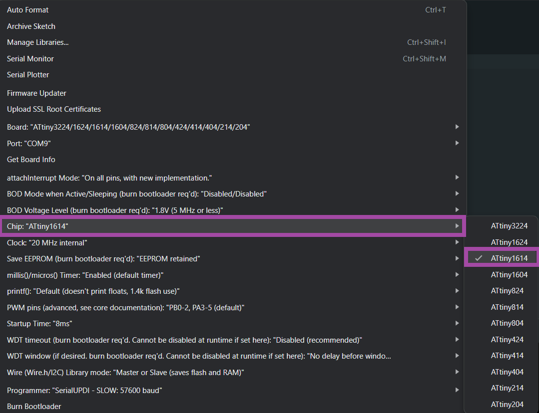The ATtiny1614 is a high-performance, low-power 8-bit AVR RISC-based microcontroller that combines 16KB ISP flash memory, 256B EEPROM, 2KB SRAM, and operates up to 20 MHz. It offers a broad range of features including 18 general purpose I/O lines, 32 general purpose working registers, three flexible timer/counters with compare modes, internal and external interrupts, a serial programmable USART, a byte-oriented 2-wire serial interface, a 10-bit ADC with 10 channels, a programmable watchdog timer with internal oscillator, and five software-selectable power saving modes.