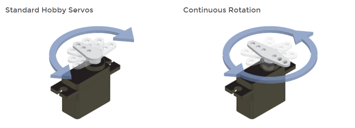 Continuous rotation or “open-loop" servos do not work like the standard servo. The control signal only controls direction and speed, not position. These enable you to easily control how fast the drive shaft is moving and in which direction it's going, but there's no feedback for position control.