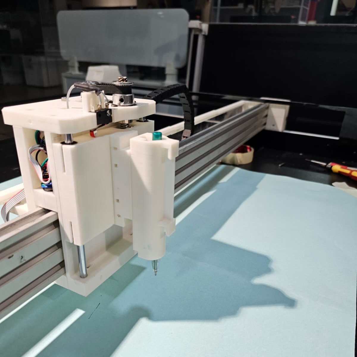 The tool changer is controlled via the plotter’s main control system, which manages the movement of the end effector and ensures the correct pen is selected based on the drawing's design.