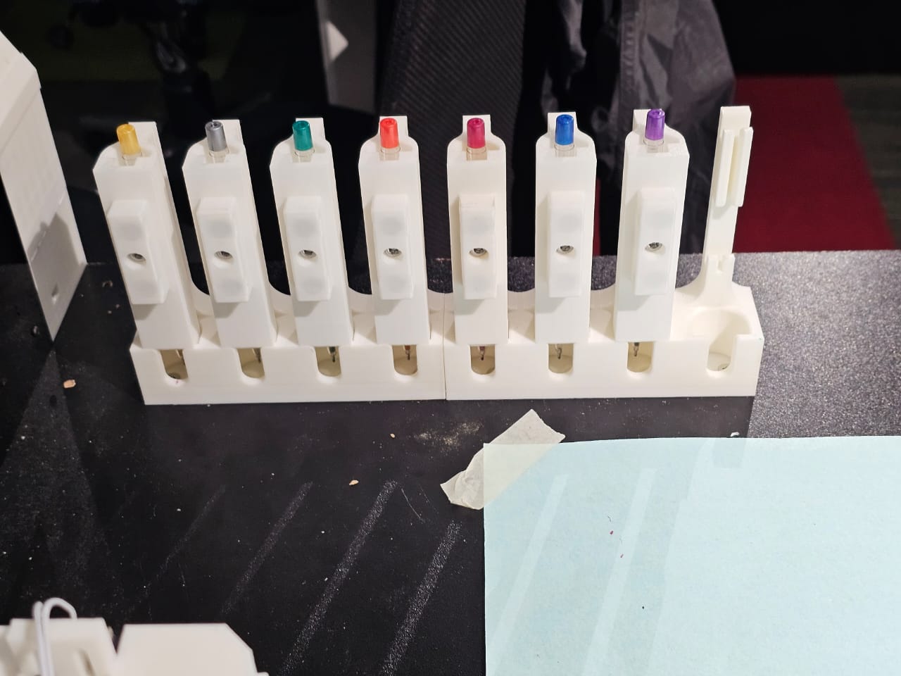The docking station holds the pens in their respective positions, ready to be picked up by the end effector.