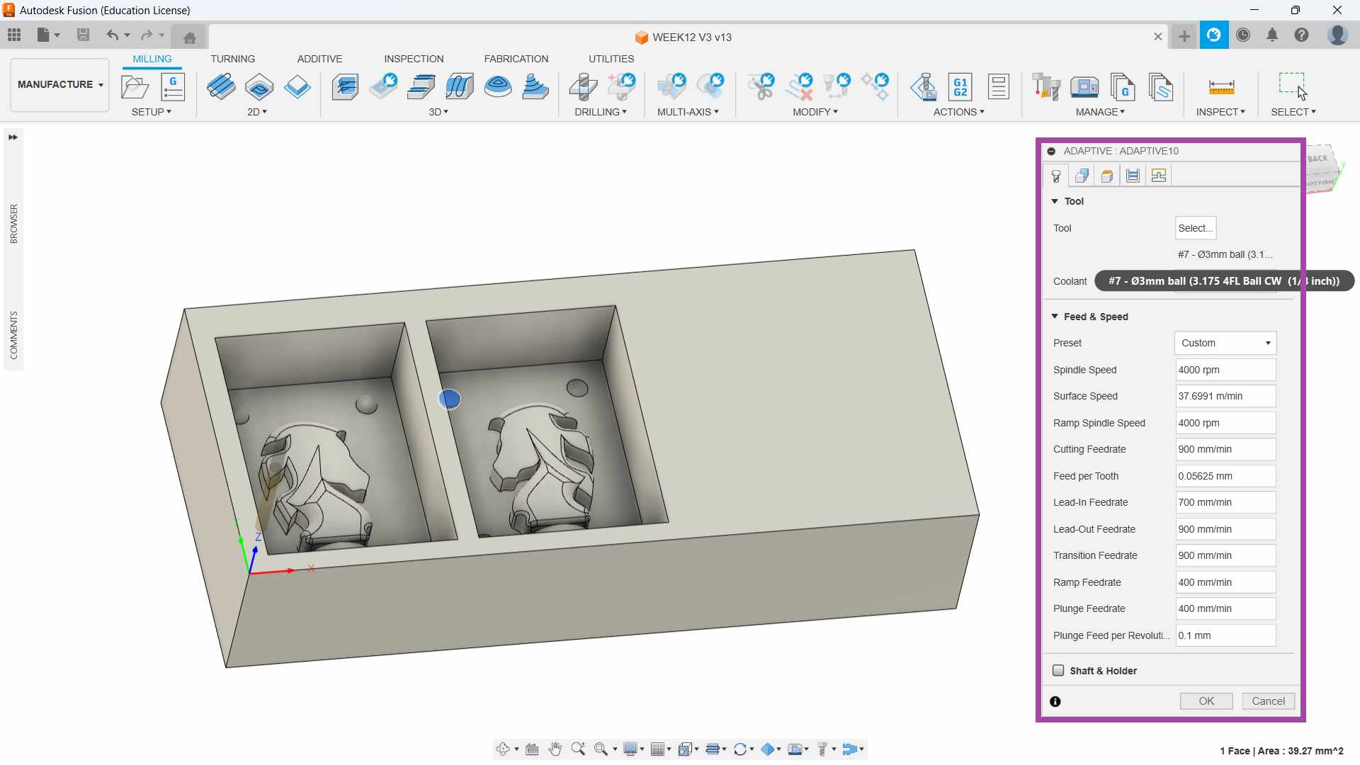 The photo below illustrates the wax after performing the adaptive operation with a 3mm ball end mill.