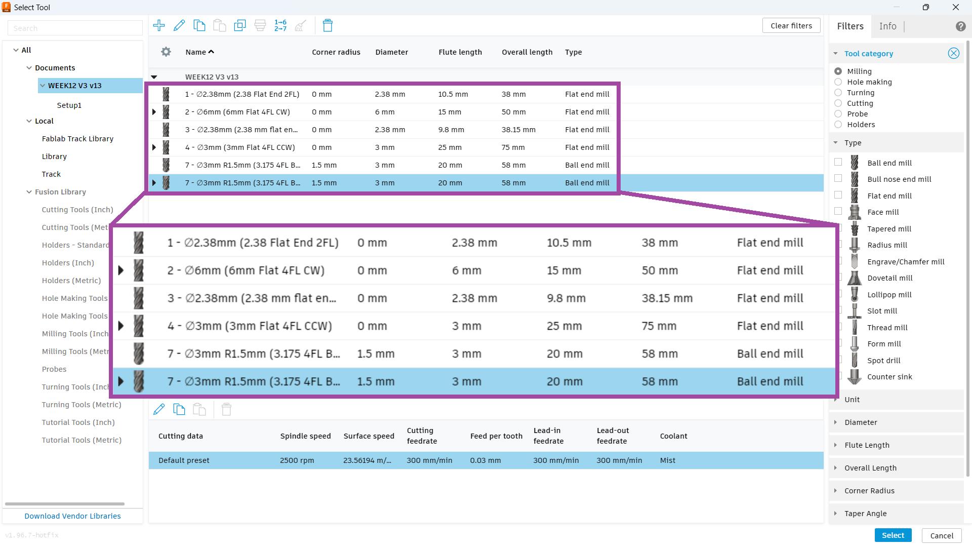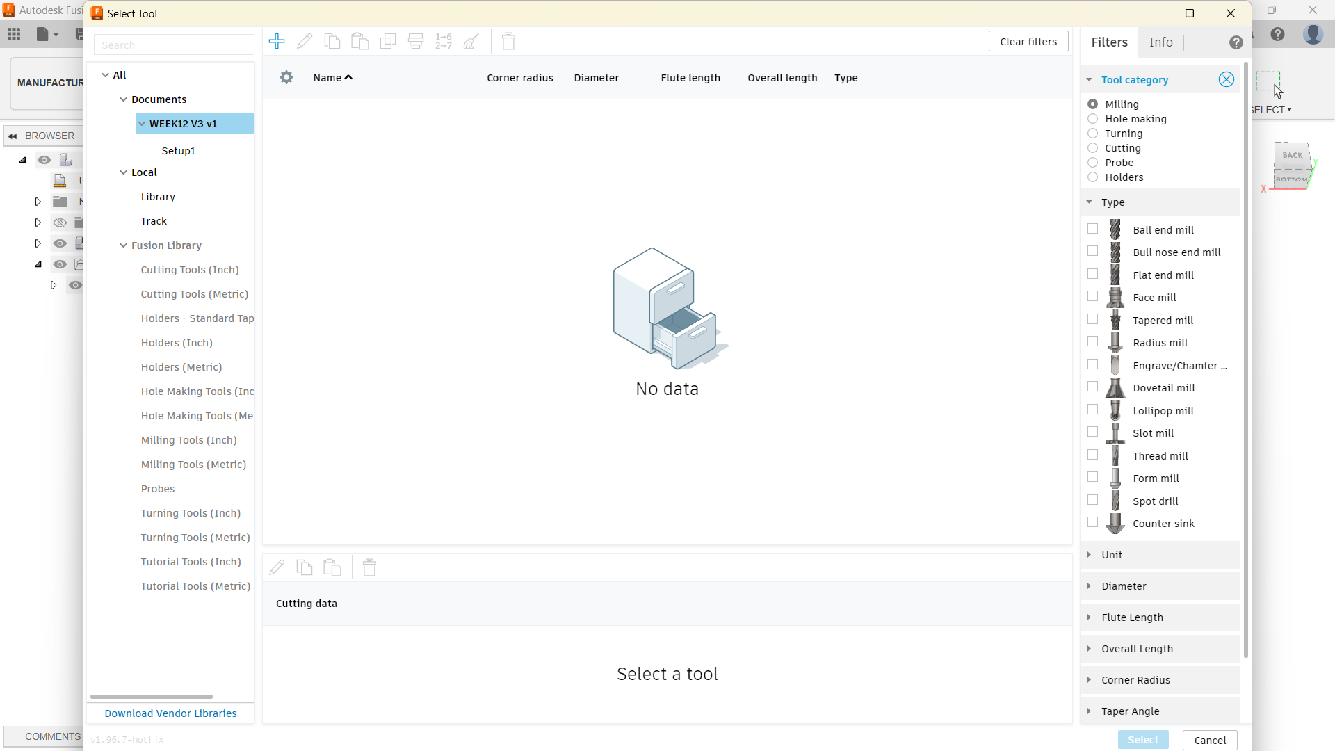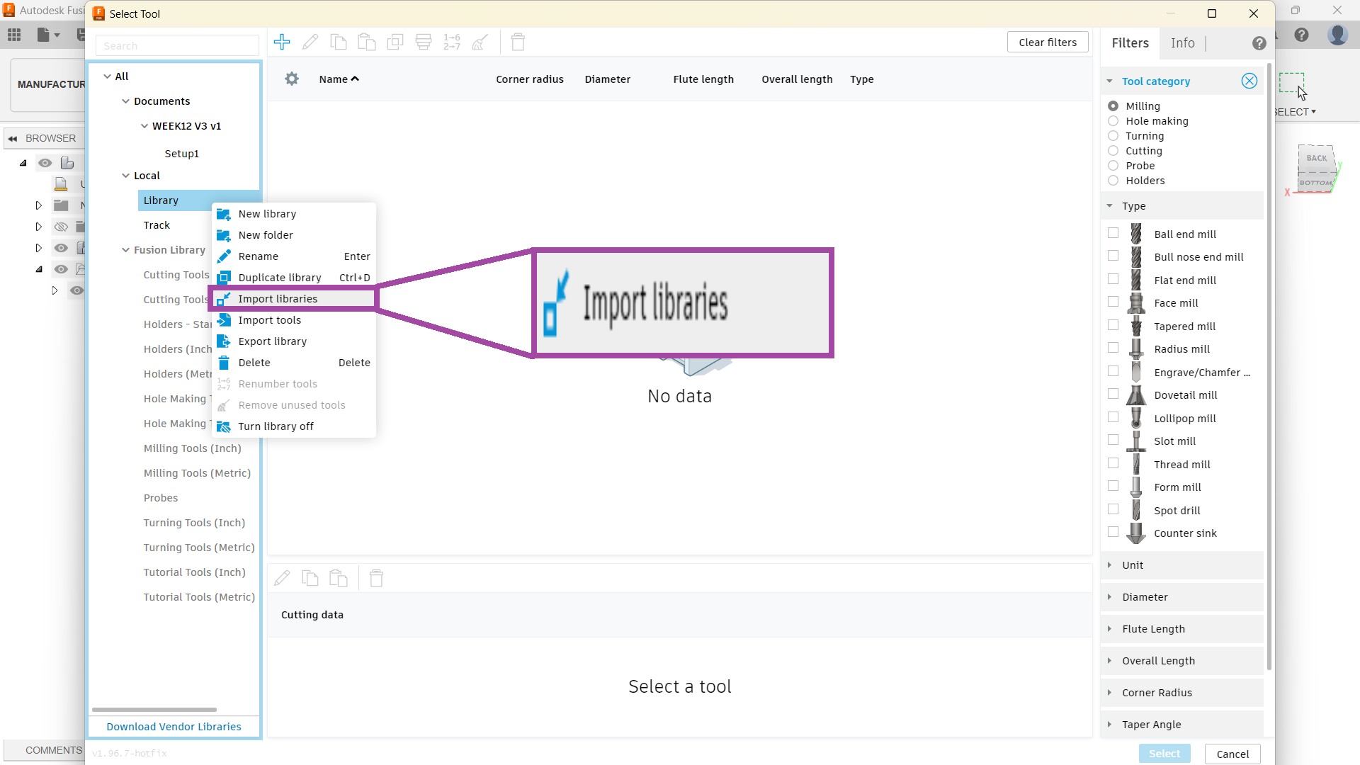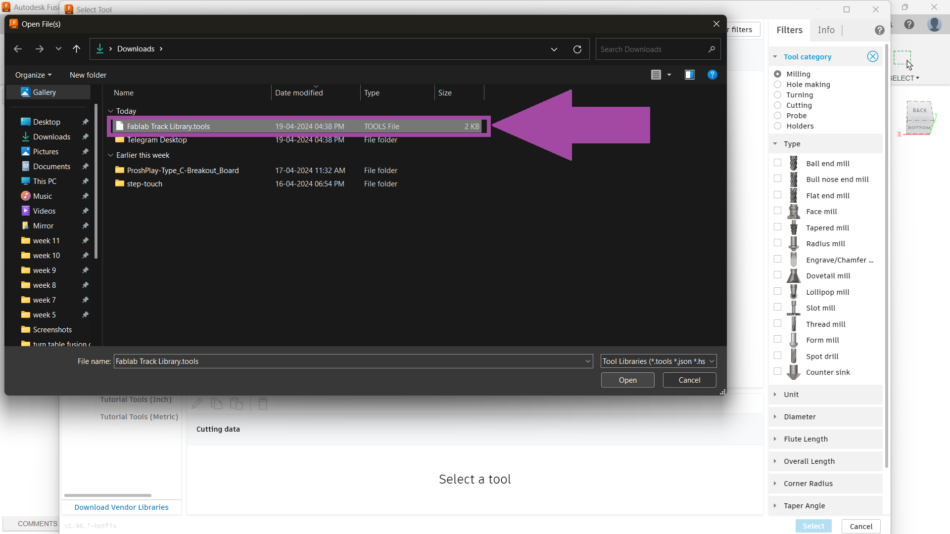 Since I am using the CAM for the first time in Fusion 360, I need to add the tools to my library. My instructor shared a tool library with the tools available in our lab.