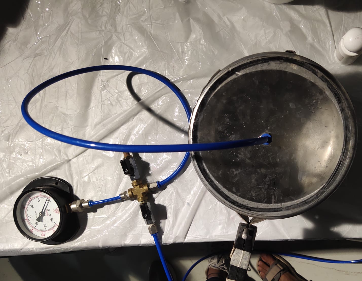 The image below illustrates the mixed resin placed inside the vacuum chamber where the air bubbles are removed from the resin.