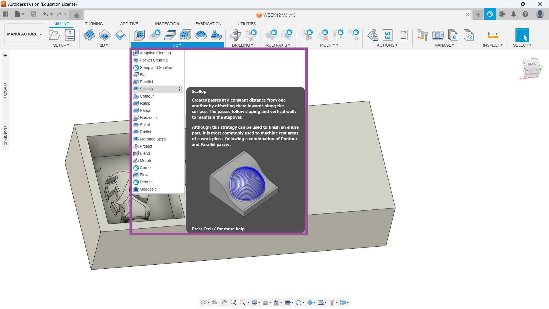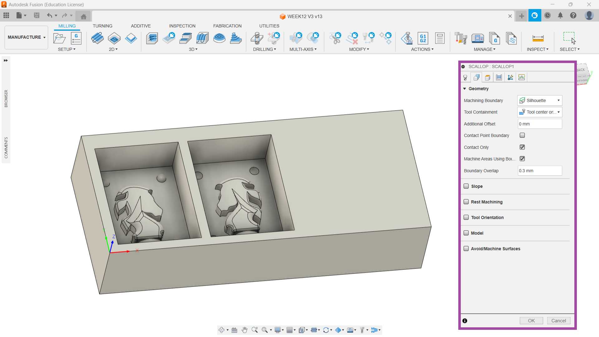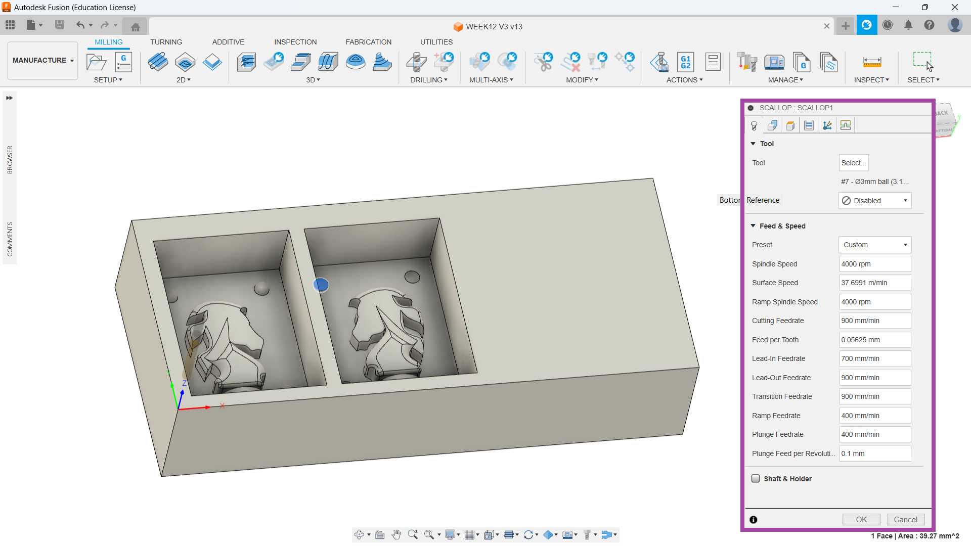 The photo below depicts the wax after performing the scallop operation with a 3mm ball end mill.