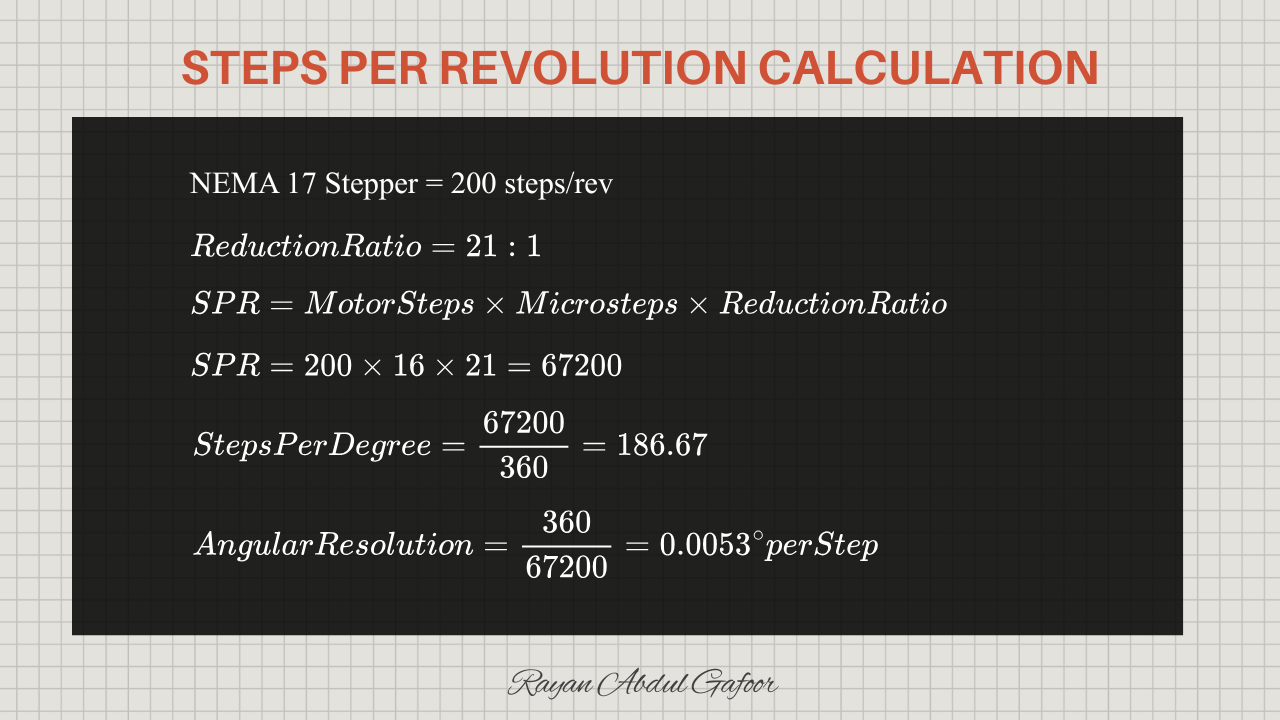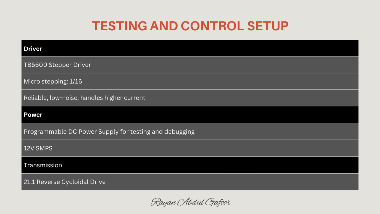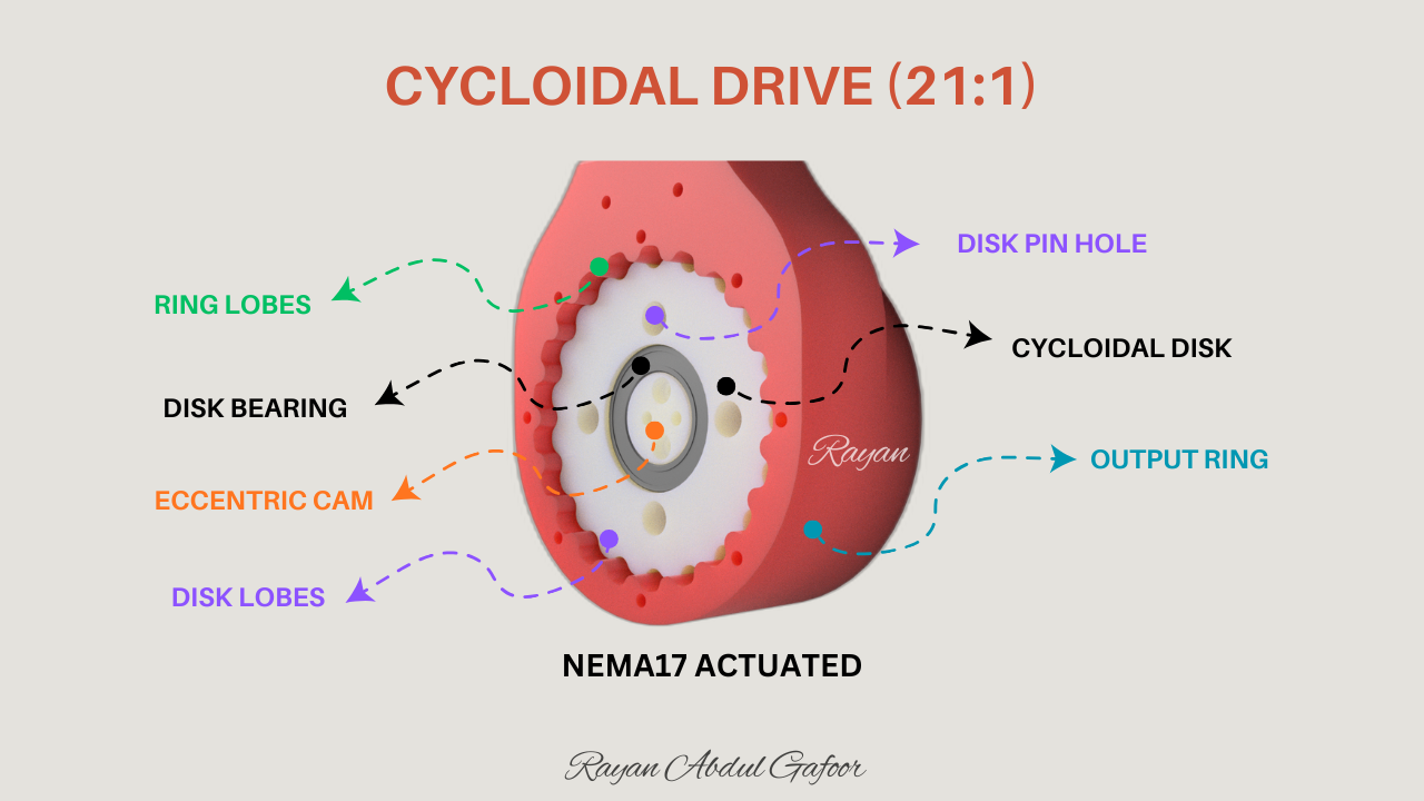 This document details a precision 21:1 cycloidal drive mechanism designed in Fusion 360, built with 3D-printed PETG, actuated by a NEMA17 stepper motor, and controlled by an ESP32 running custom Arduino firmware. Designed for high-torque, low-backlash positioning in robotics and automation applications. The drive achieves a reduction ratio of 21:1, supporting accurate and repeatable motion for high-precision positioning tasks.