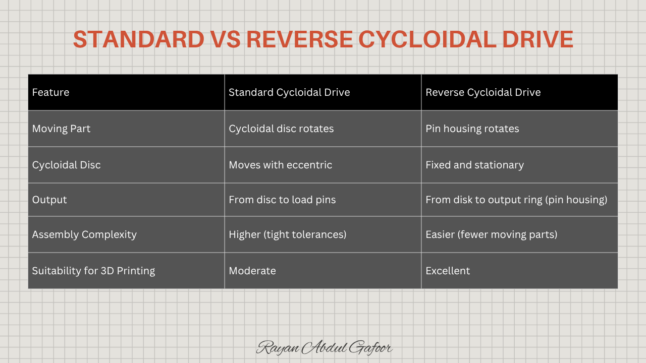 By using a reverse cycloidal drive, I avoid these unnecessary geometric complications, maintain a coaxial joint layout, and ensure simpler, more robust kinematic modelling for the manipulator.