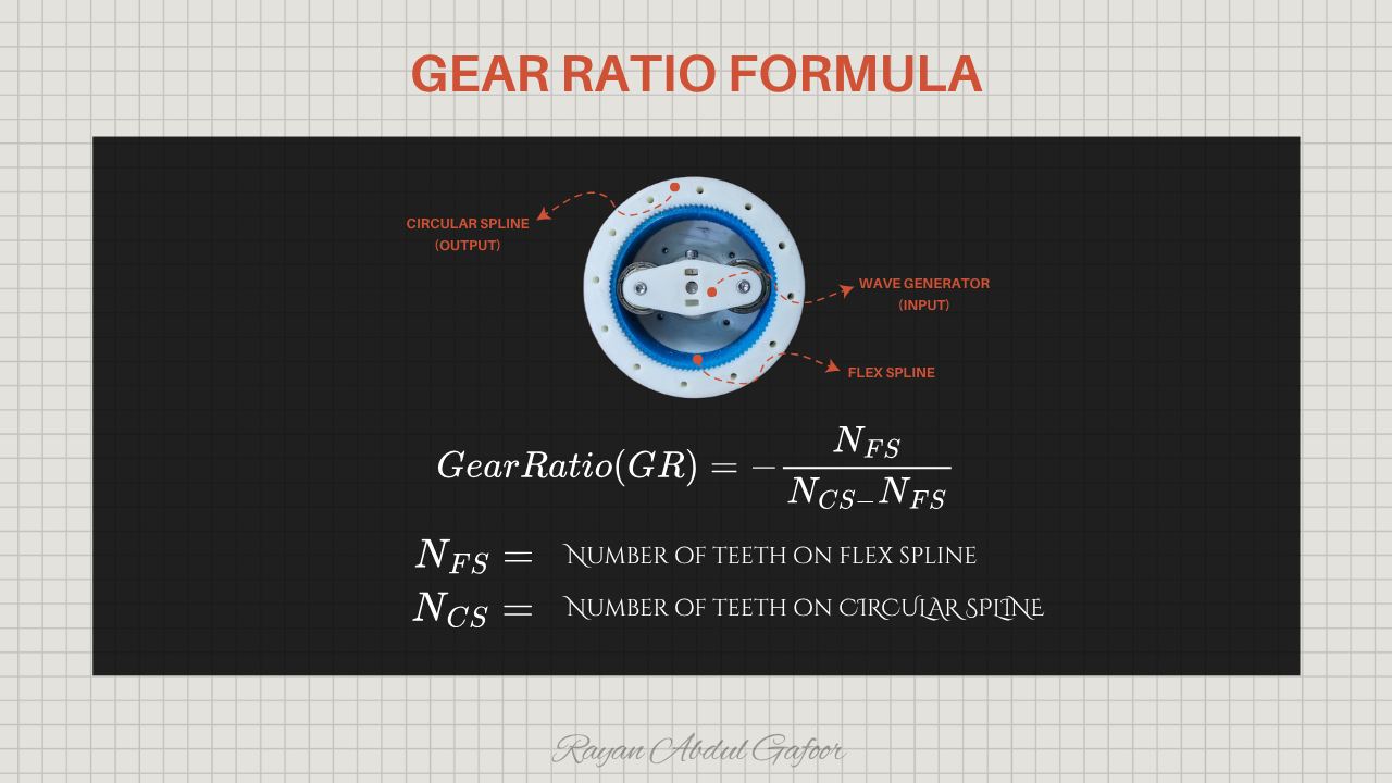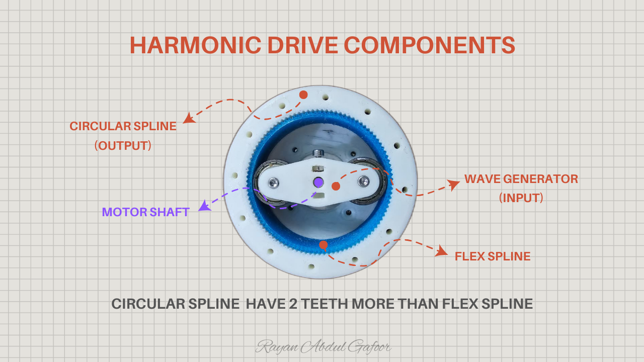- Circular Spline: a rigid ring with internal teeth (slightly more teeth than the flex spline).