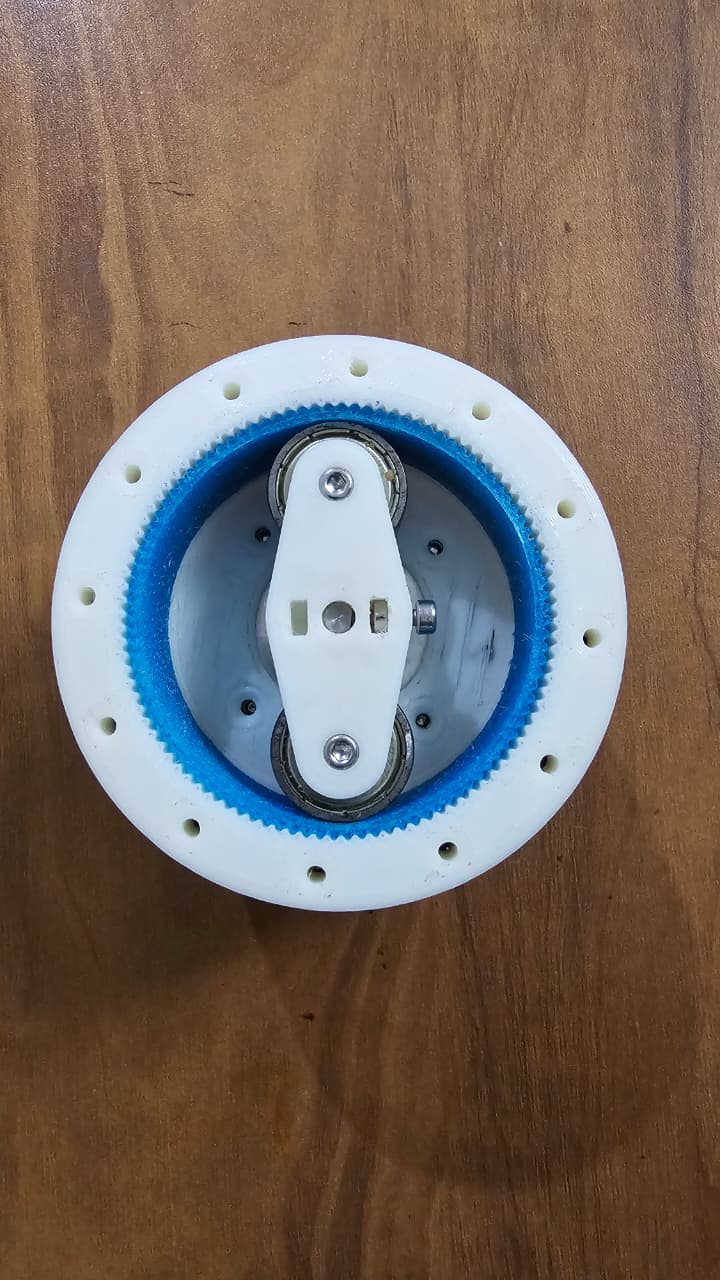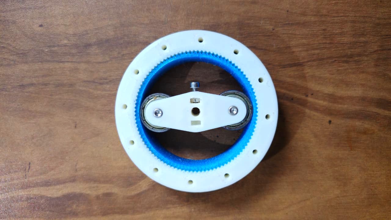 The flex spline is printed in TPU while the other components are PETG. The drive performs accurately under axial loads, but it struggles with radial loads because the flexible TPU teeth tend to slip against the circular spline. This issue can be resolved by printing the flex spline in stronger, more rigid Nylon 6 using SLS technology instead of FDM.
