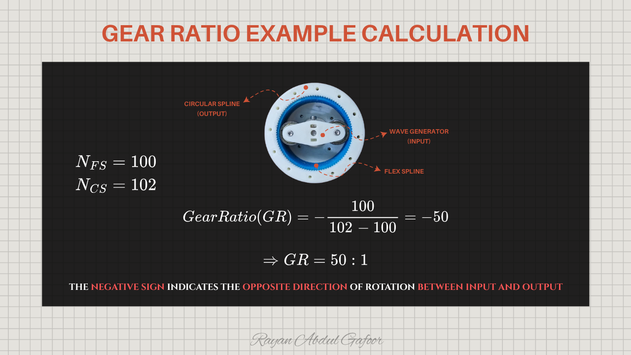 In a harmonic drive, the negative sign in the gear ratio simply means th e output rotates in the opposite direction of the input .