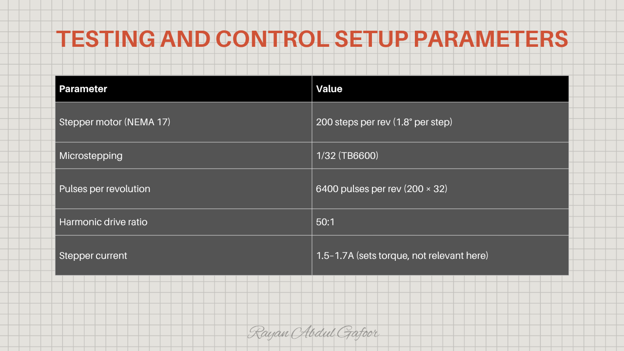 The setup uses a NEMA 17 stepper motor with 200 steps per revolution (1.8° per step), driven at 1/32 micro stepping through a TB6600 for a total of 6400 pulses per revolution, paired with a 50:1 harmonic drive.