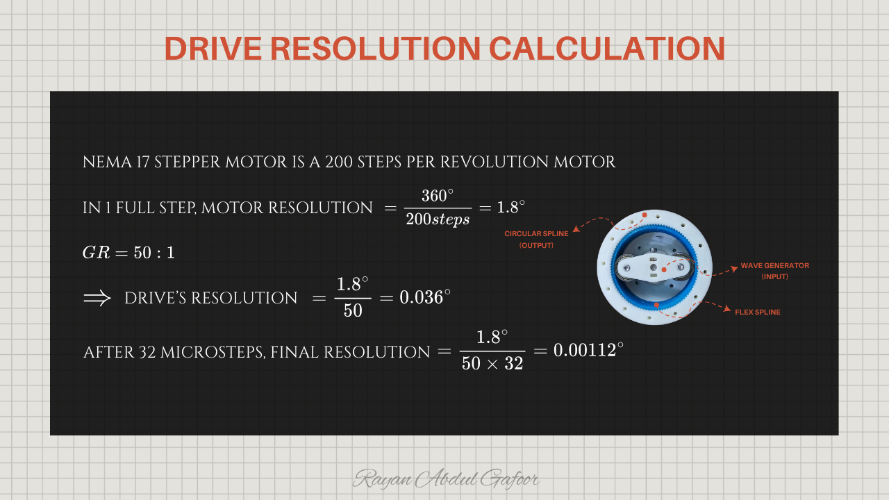 The system achieves 0.036 degree per full step , and with 1/32 micro stepping , the resolution improves to 0.00112 degree , enabling very precise movement.