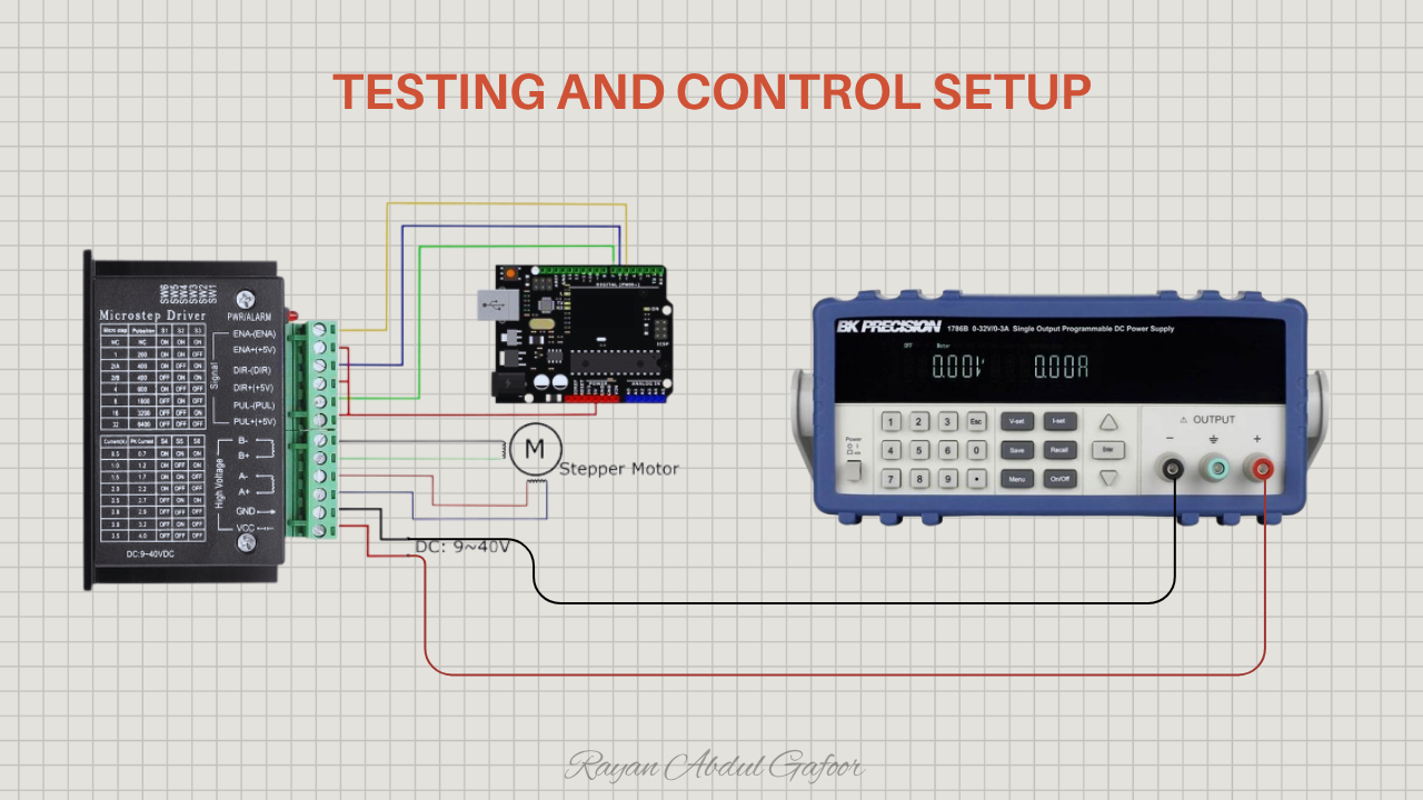 The NEMA17-driven harmonic drive was tested using an Arduino microcontroller and a TB6600 stepper driver, powered by a programmable power supply. The gearbox was modeled in Fusion 360 and fabricated using a Prusa i3 3D printer.